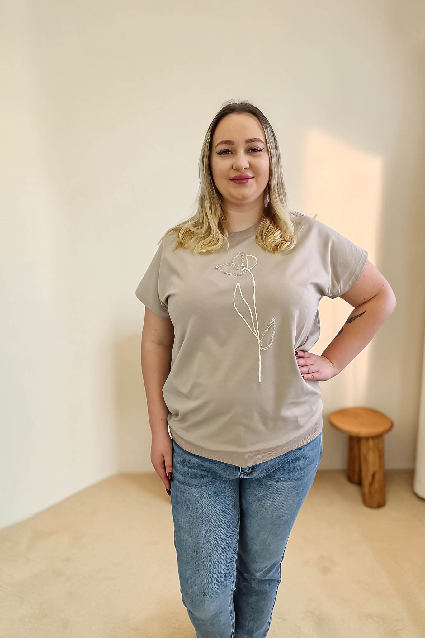 Model charakteryzuje się luźnym fasonem, który kończy się praktycznym ściągaczem. Pozwala to na dowolne stylizowanie bluzki – można ją nosić puszczoną luźno lub lekko podwiniętą, co świetnie modeluje sylwetkę i maskuje ewentualne niedoskonałości w okolicach talii. Okrągły dekolt oraz krótki rękaw czynią ją bazą idealną na wiosenne i letnie dni.