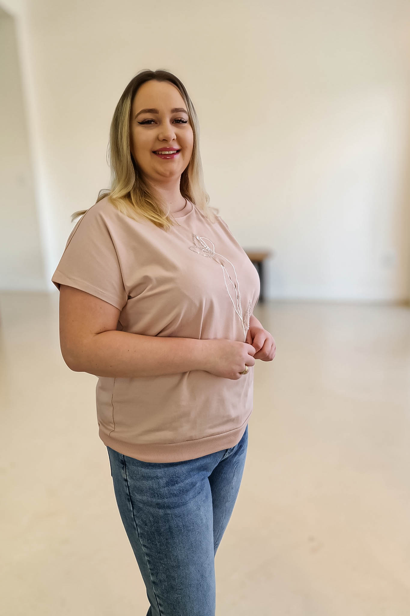Model charakteryzuje się luźnym fasonem, który kończy się praktycznym ściągaczem. Pozwala to na dowolne stylizowanie bluzki – można ją nosić puszczoną luźno lub lekko podwiniętą, co świetnie modeluje sylwetkę i maskuje ewentualne niedoskonałości w okolicach talii. Okrągły dekolt oraz krótki rękaw czynią ją bazą idealną na wiosenne i letnie dni.