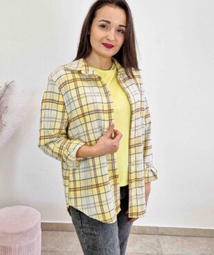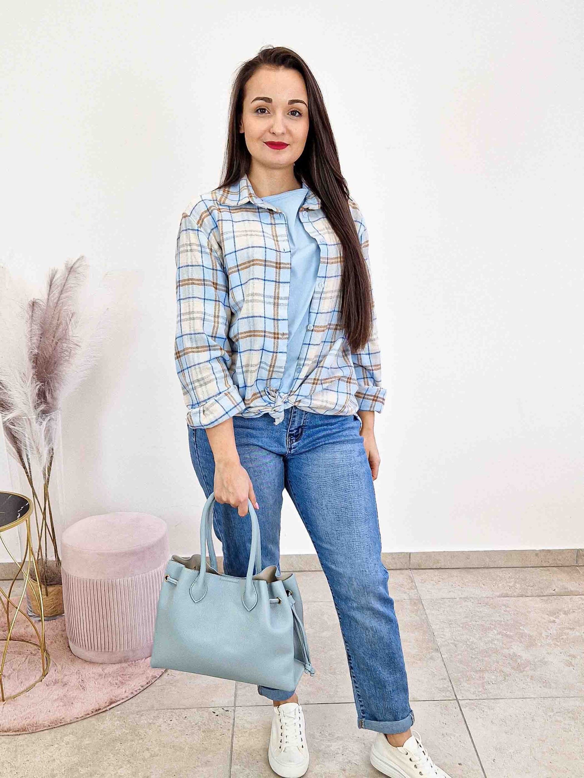 Koszula posiada tradycyjny kołnierzyk oraz zapięcie na guziki, co pozwala na noszenie jej na wiele sposobów – całkowicie zapiętą, narzuconą na t-shirt jako lekka narzutka lub fantazyjnie zawiązaną w pasie. Koszula z długim rękawem wykończona mankietami daje możliwość ich podwinięcia, co nadaje stylizacji luźniejszego, casualowego charakteru. Lekka asymetria długości sprawia, że fason prezentuje się nowocześnie i optycznie wysmukla sylwetkę.