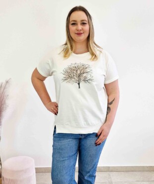 Ten model to doskonałe połączenie casualowej swobody i oryginalnego designu. Bawełniana bluzka damska o przedłużonym kroju to propozycja, która zapewnia maksymalny komfort noszenia, jednocześnie skutecznie maskując ewentualne mankamenty sylwetki dzięki formie tuniki. Charakterystyczny nadruk z motywem drzewa nadaje całości wyjątkowego wyrazu, sprawiając, że ten t-shirt damski oversize staje się głównym punktem każdej codziennej stylizacji.