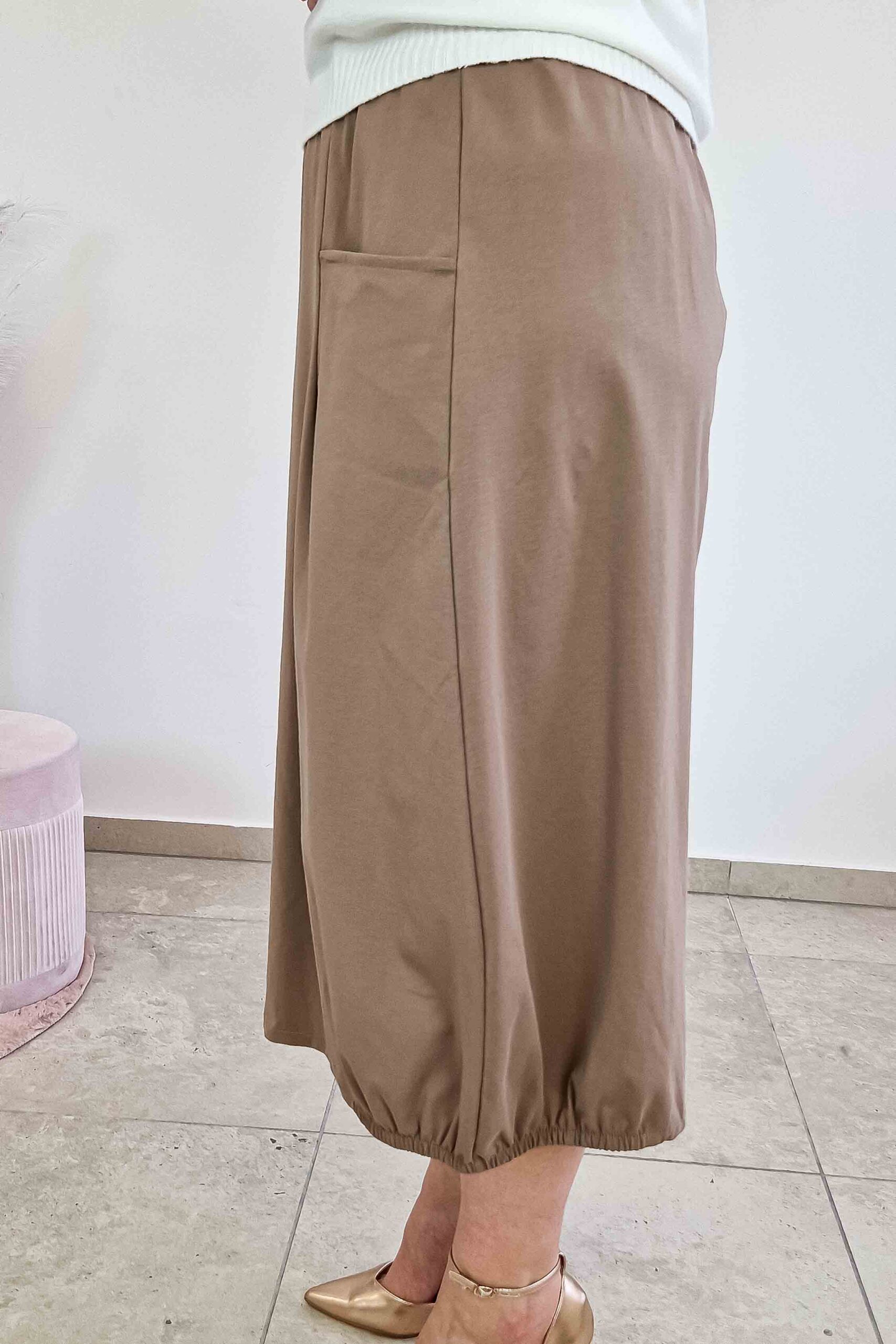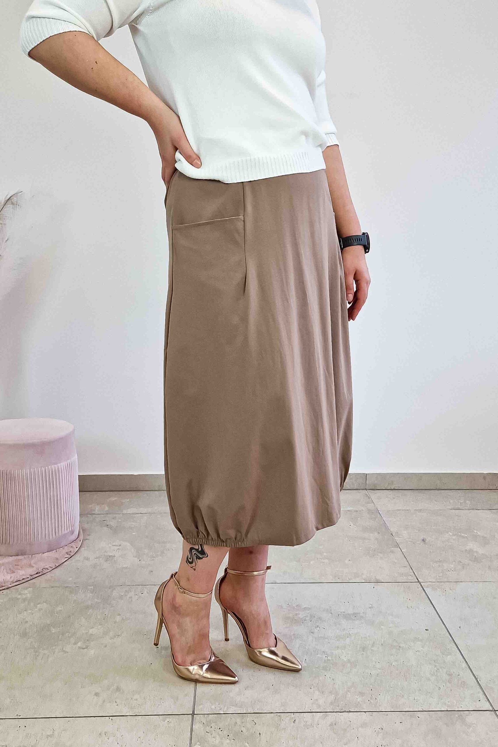 Fason bombki tej spódnicy to doskonały sposób na podkreślenie kobiecej sylwetki w sposób delikatny i subtelny. Spódnica jest luźna w dolnej części, dzięki czemu tworzy zgrabny kształt i lekko unosi się przy ruchu. Gumki na dole po bokach dodają objętości, co sprawia, że spódnica jest bardziej zwiewna i dynamiczna. Z kolei gumka w pasie sprawia, że spódnica dobrze trzyma się ciała, podkreślając talię i dodając proporcji sylwetce. Pasek, który znajduje się w zestawie, pozwala na dodatkową regulację, dzięki czemu spódnica idealnie dopasowuje się do każdej figury.