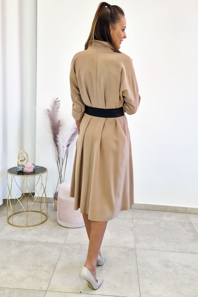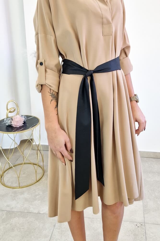 Trapezowy krój zapewnia swobodę ruchów, a dekolt V i kołnierzyk dodają stylizacji szyku. Dzięki paskowi w talii możesz nosić ją na dwa sposoby – luźno lub podkreślając sylwetkę. Materiał jest miękki, przyjemny w dotyku i doskonale układa się na ciele, co gwarantuje komfort przez cały dzień.