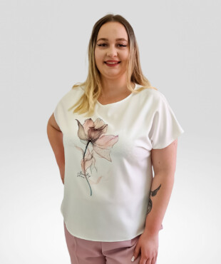 Jej luźny fason, okrągły dekolt i delikatna kwiatowa aplikacją sprawiają, że wygląda świeżo, kobieco i modnie. Ta modna bluzka damska z krótkim rękawem to połączenie codziennego komfortu z delikatnym, kobiecym akcentem. Aplikacja w kwiaty ozdobiona cyrkoniami sprawia, że stylizacja nabiera lekkości i subtelnej elegancji – bez przesady, ale z charakterem. Luźny fason nie opina sylwetki, dzięki czemu dobrze się układa, a przyjemna w dotyku tkanina sprawia, że chcesz ją nosić przez cały dzień.