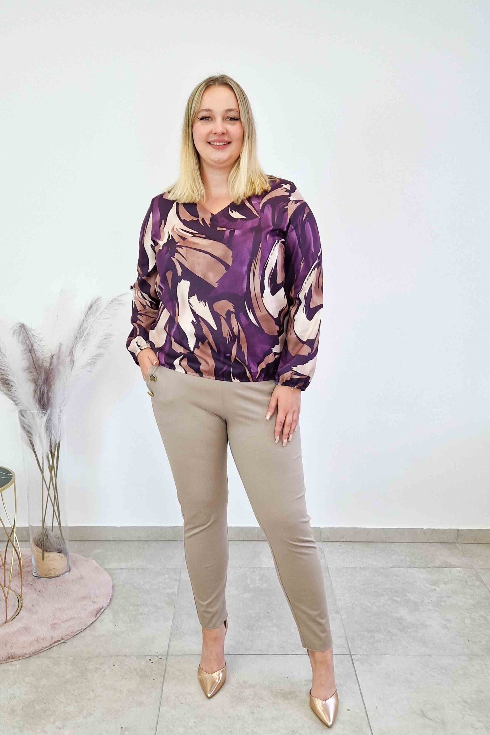 Utrzymana w tonacji fioletowo–beżowej z nutą błękitu, przyciąga wzrok i podkreśla kobiecą urodę. Dekolt w kształcie litery V wysmukla szyję, a długi rękaw czyni ją idealną propozycją na sezon jesienno–zimowy. To modna bluzka na co dzień i do pracy, która świetnie łączy elegancję z wygodą.