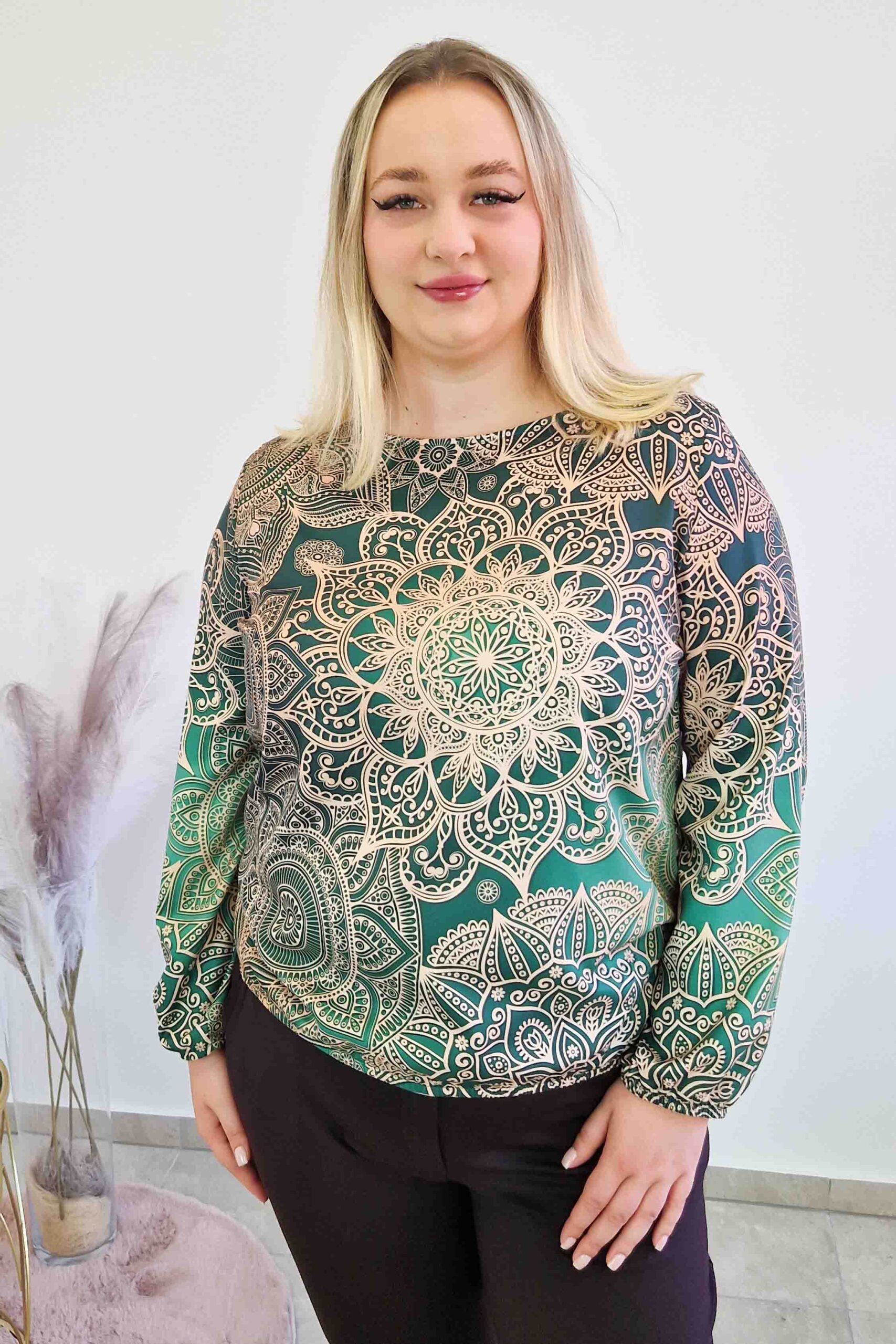 Ta elegancka bluzka damska w mandale to idealny wybór dla kobiet, które lubią wyróżniać się subtelnym stylem. Delikatny niebiesko-beżowy wzór inspirowany orientalną mandalą nadaje jej wyjątkowego charakteru i sprawia, że każda stylizacja zyskuje lekkość i kobiecość.