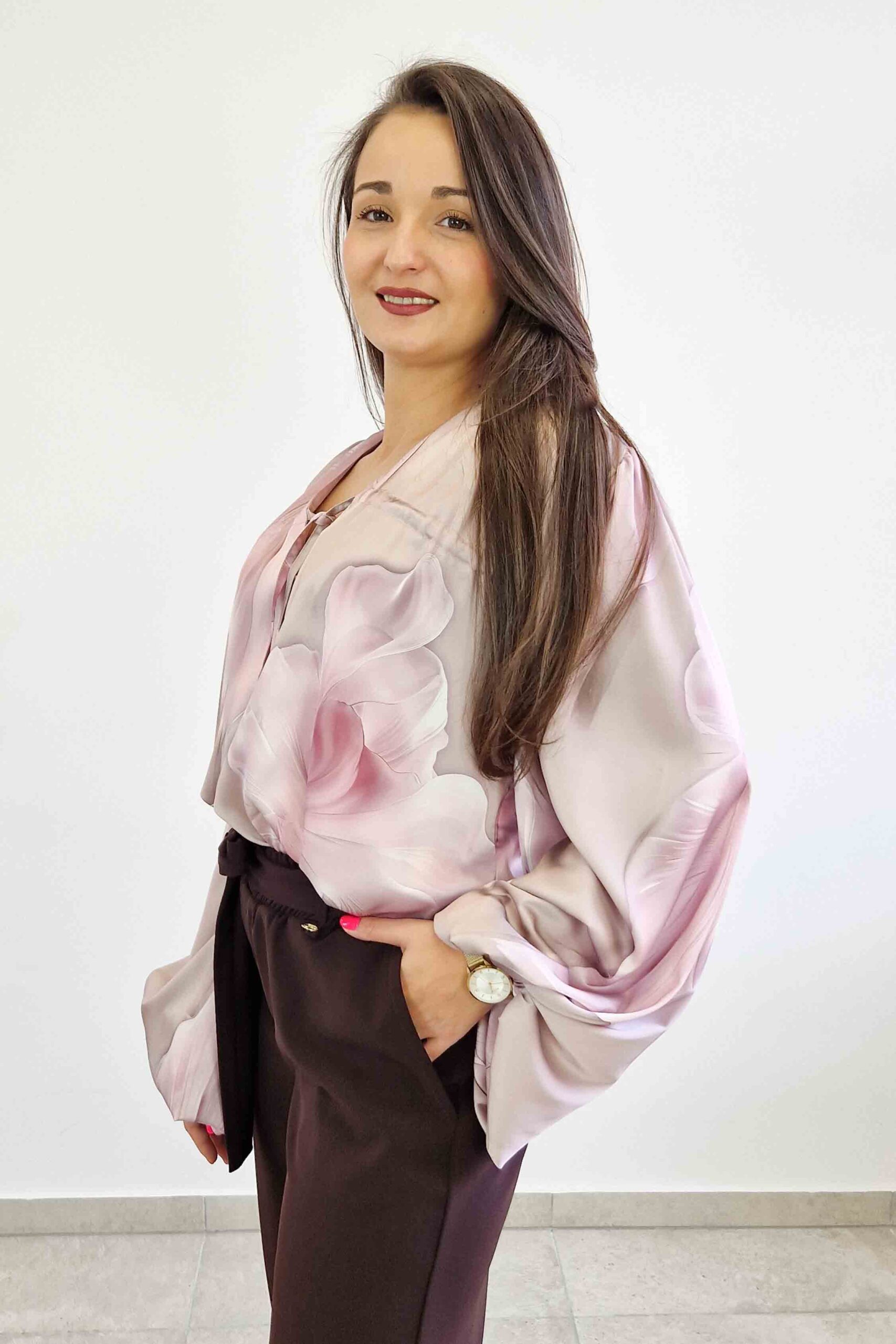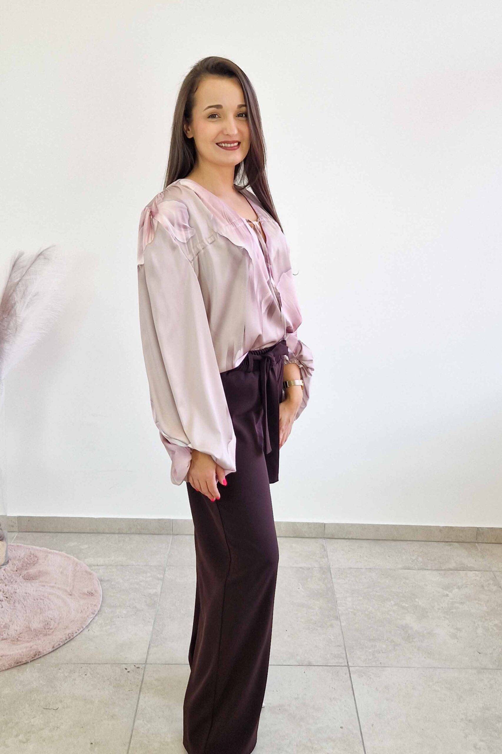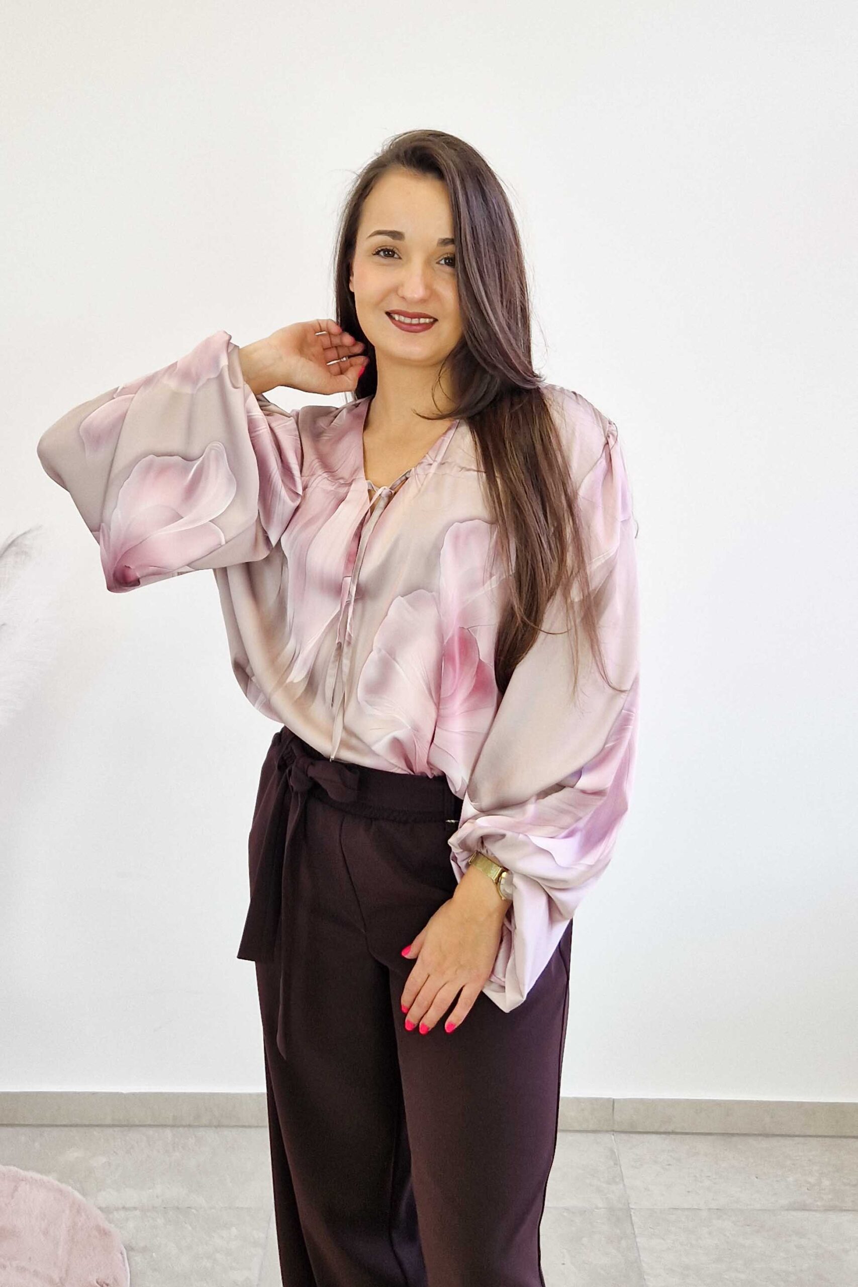 Jej pudrowo różowy kolor subtelnie rozświetla cerę, a lejący materiał pięknie układa się na sylwetce. To doskonała elegancka bluzka na co dzień, do pracy, na spotkanie lub wieczorne wyjście. Ta bluzka damska z atłasu to połączenie klasy i kobiecego uroku. Jej lejący fason pięknie dopasowuje się do sylwetki, tworząc elegancką linię bez efektu opinania. Bufiaste rękawy i dekolt V z wiązaniem przyciągają uwagę, nadając całości subtelny, romantyczny charakter.