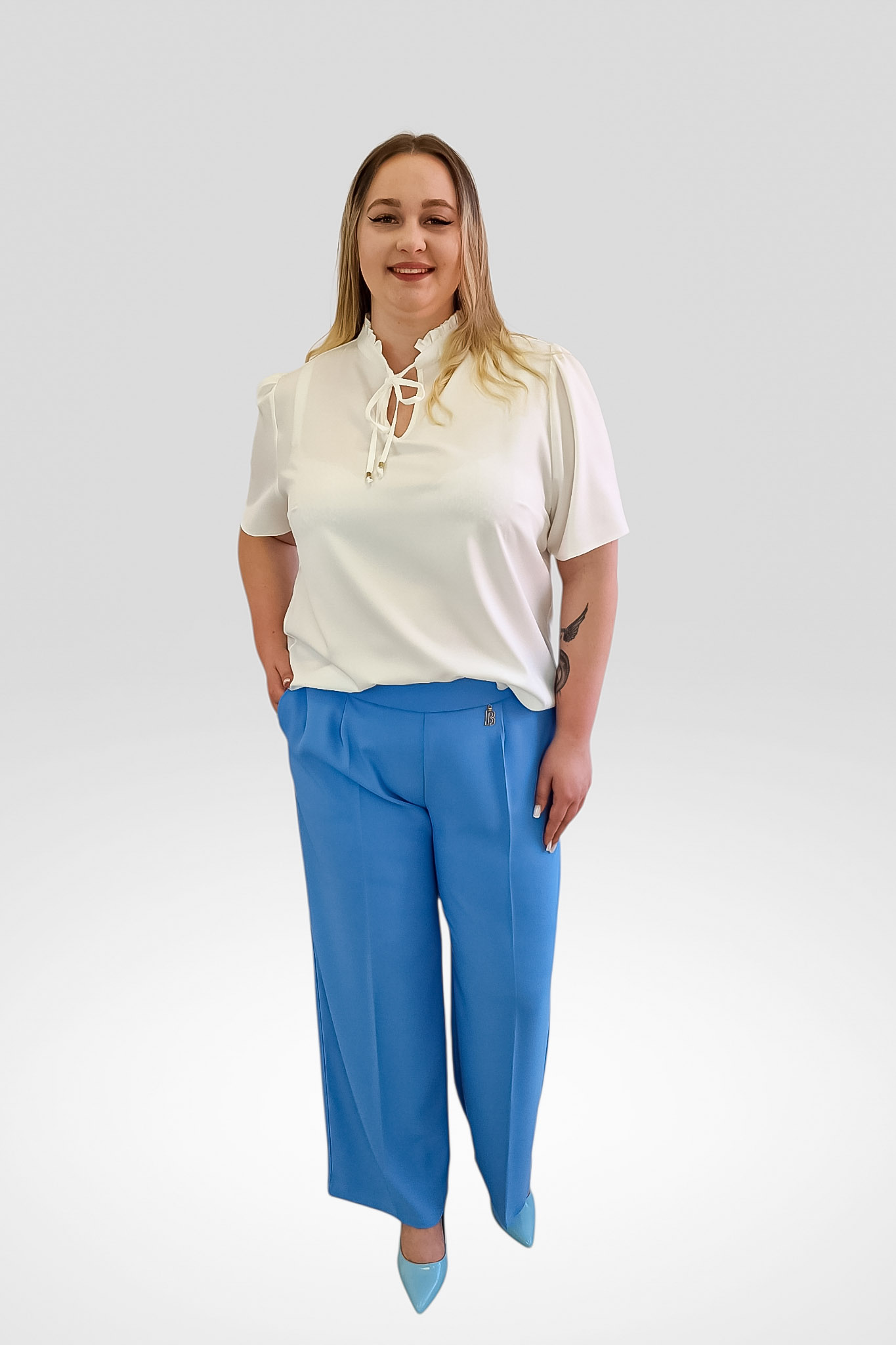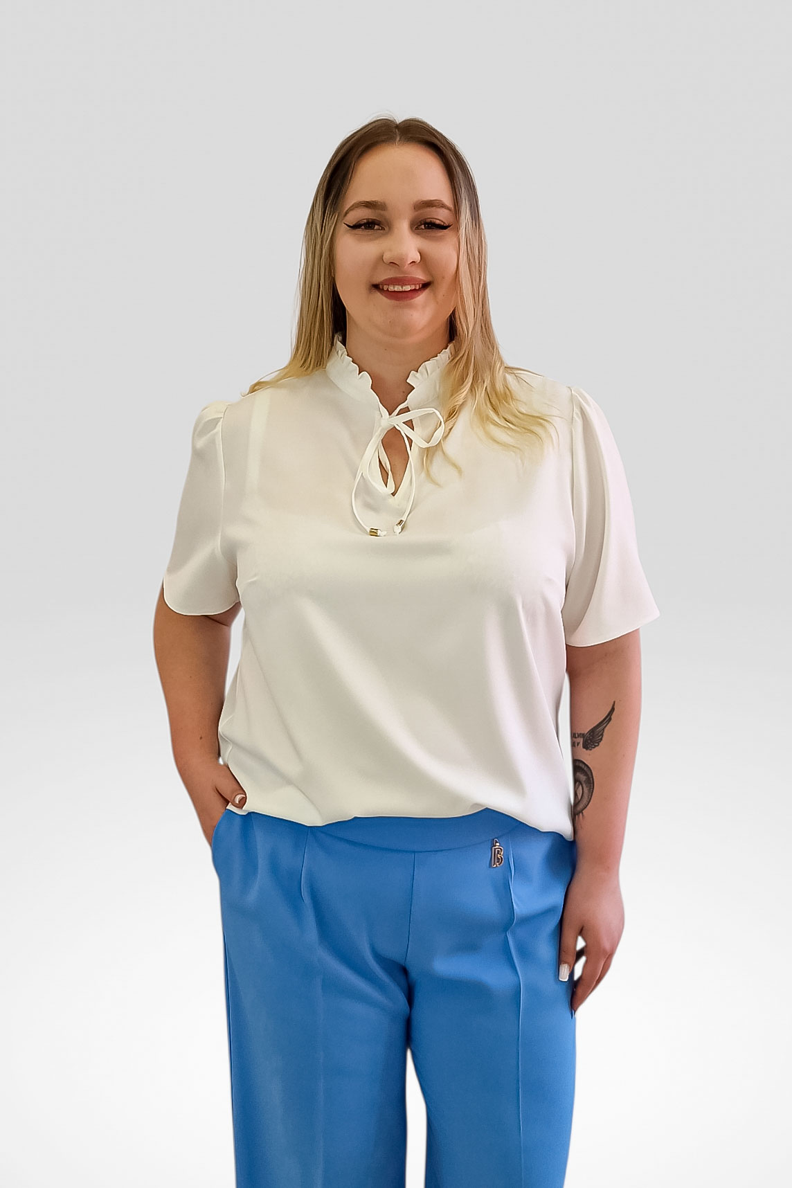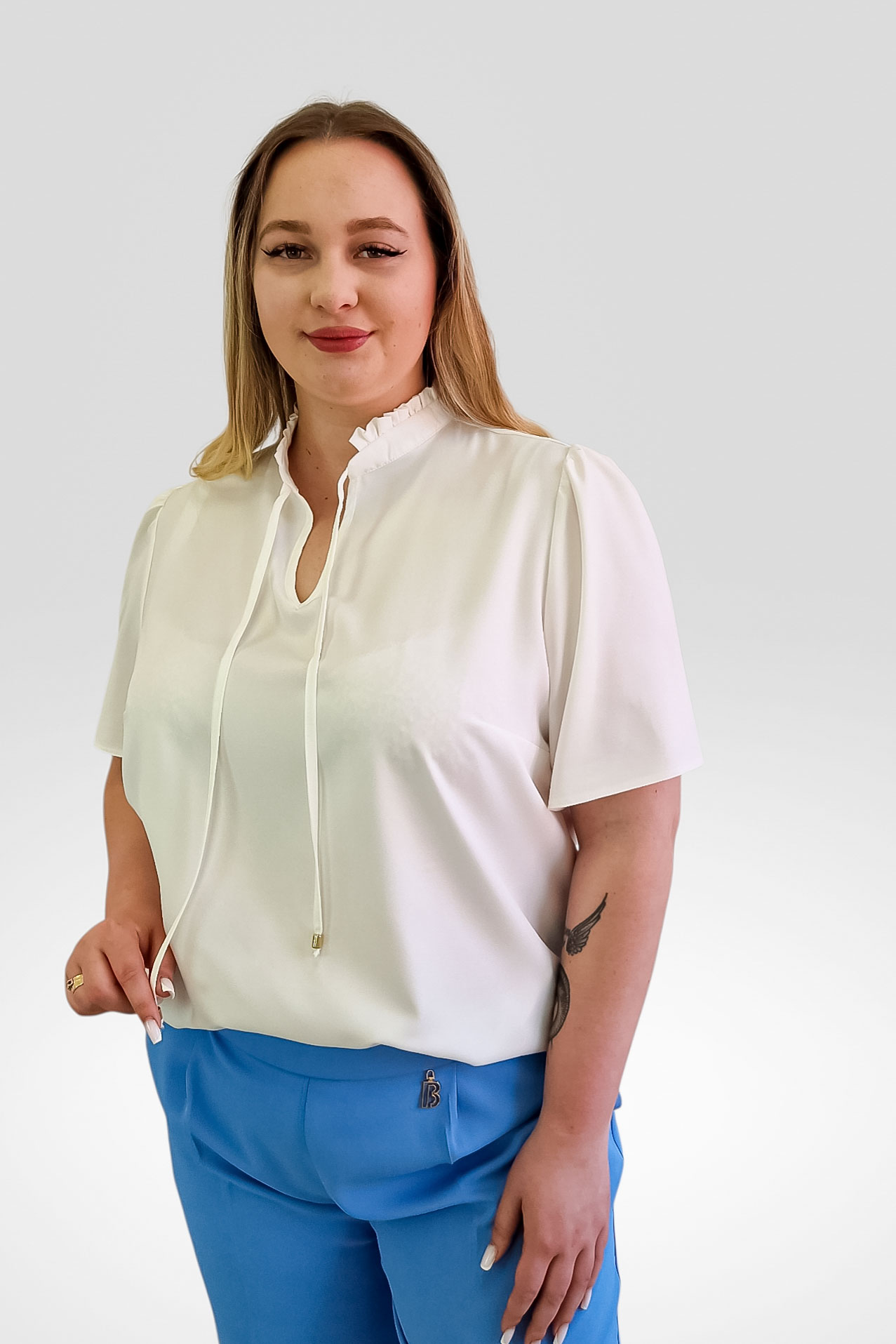 Szukasz idealnej bazy do eleganckich zestawień? Ta biała bluzka wizytowa to doskonały wybór do pracy, na rodzinne uroczystości czy oficjalne spotkania. Rewelacyjnie komponuje się z klasycznymi czarnymi spodniami, spódnicami ołówkowymi lub pod żakiet. Dzięki dodatkowi elastanu, dzianina jest elastyczna i idealnie dopasowuje się do figury, nie krępując ruchów.