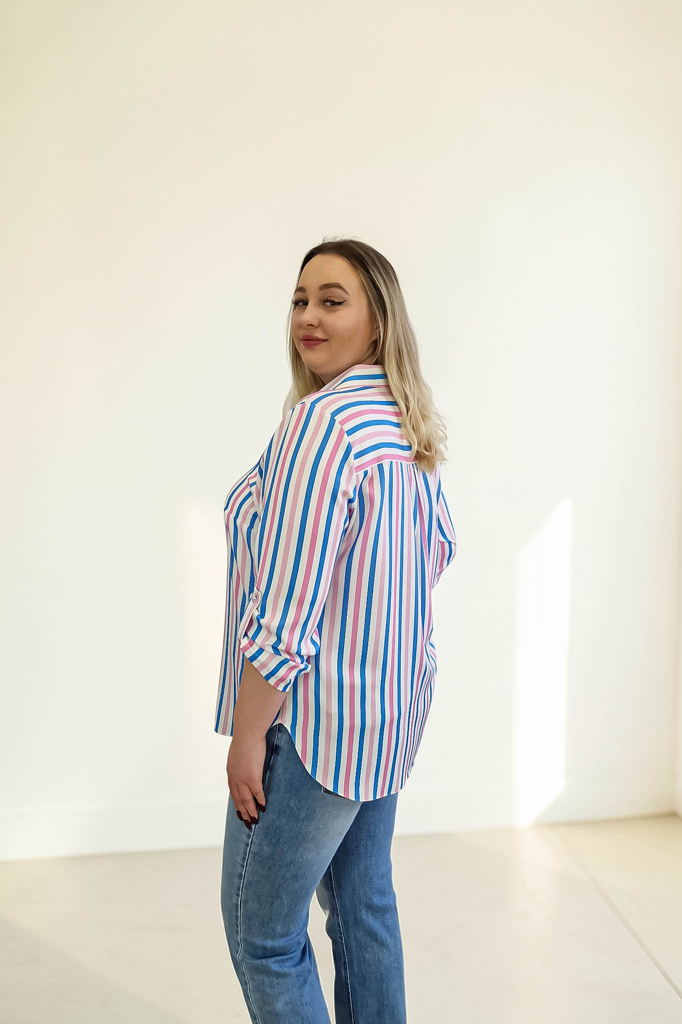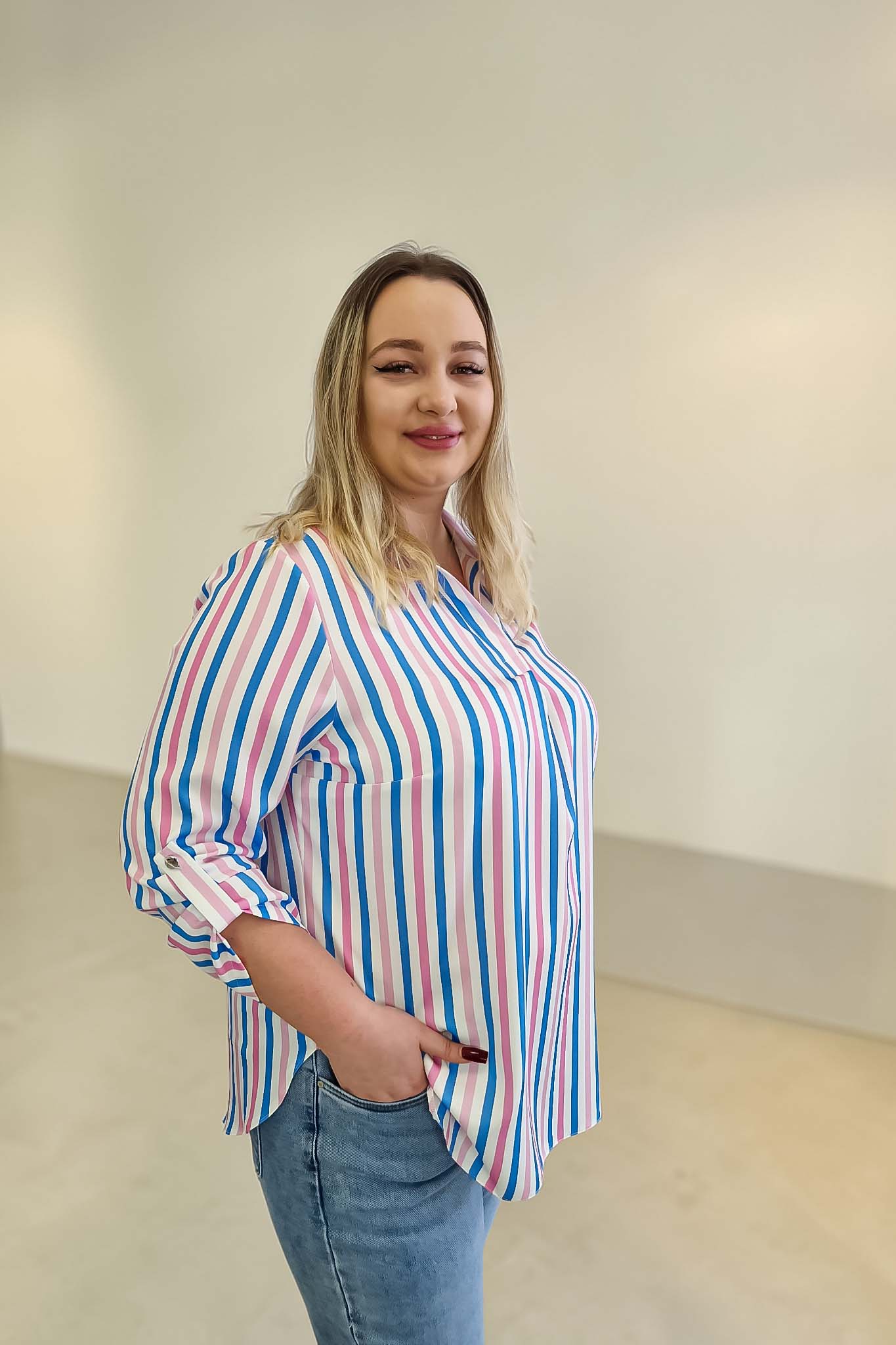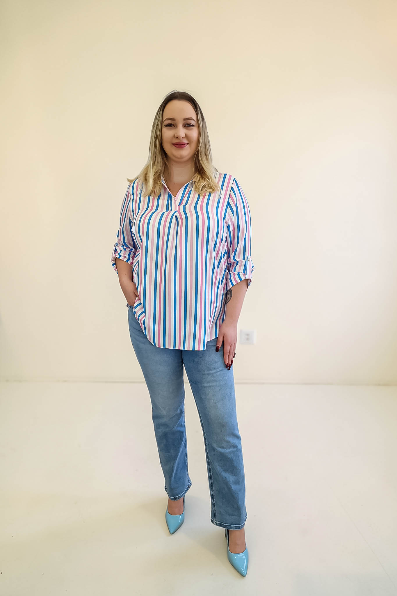 Poznaj bluzkę, która stanie się Twoim ulubionym elementem garderoby na nadchodzący sezon. Pionowe, różowo-niebieskie paski to sprawdzony sposób na optyczne wysmuklenie sylwetki, a dodatkowe wycięcia z boku sprawiają, że bluzka rewelacyjnie układa się na biodrach, nie krepując ruchów. To idealne połączenie swobodnego fasonu z eleganckimi detalami, takimi jak dekolt V z kołnierzykiem, który pięknie eksponuje szyję.