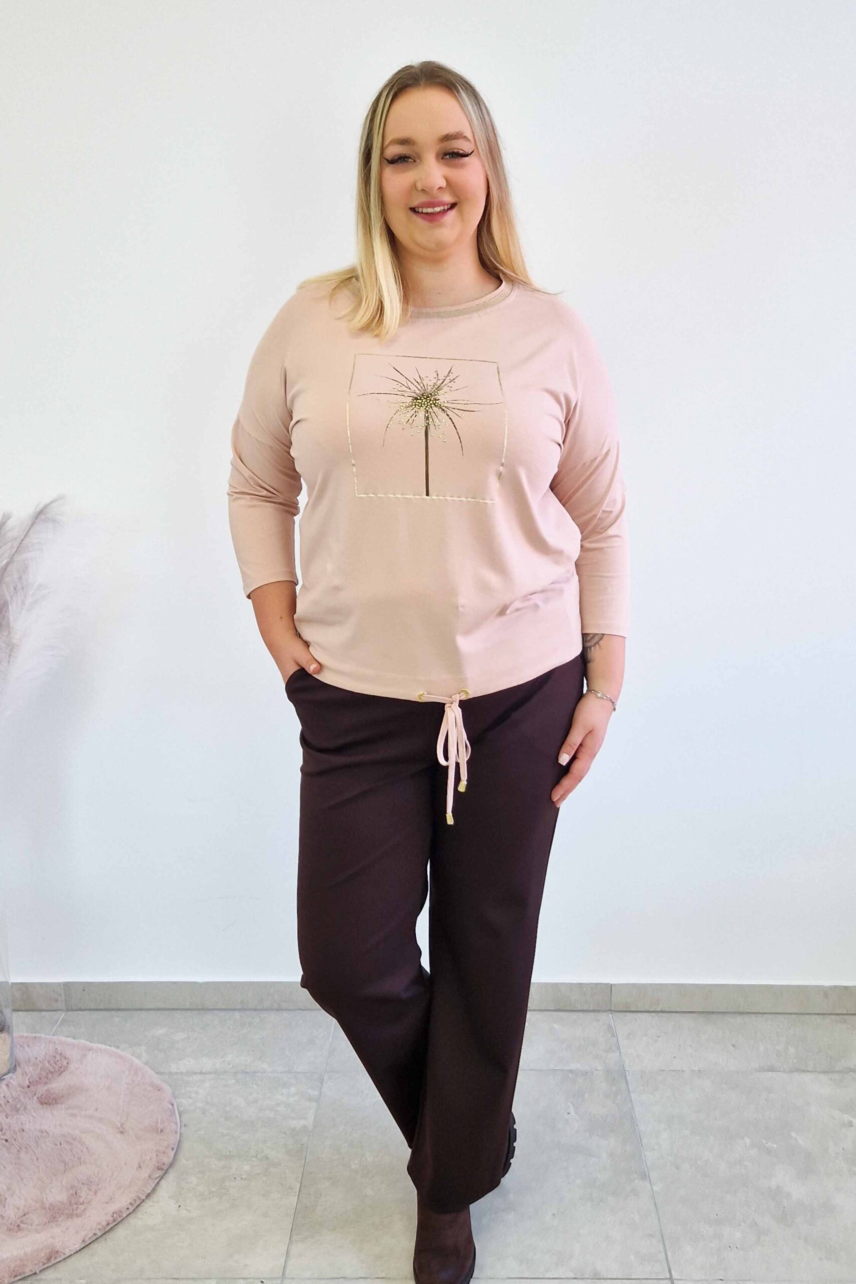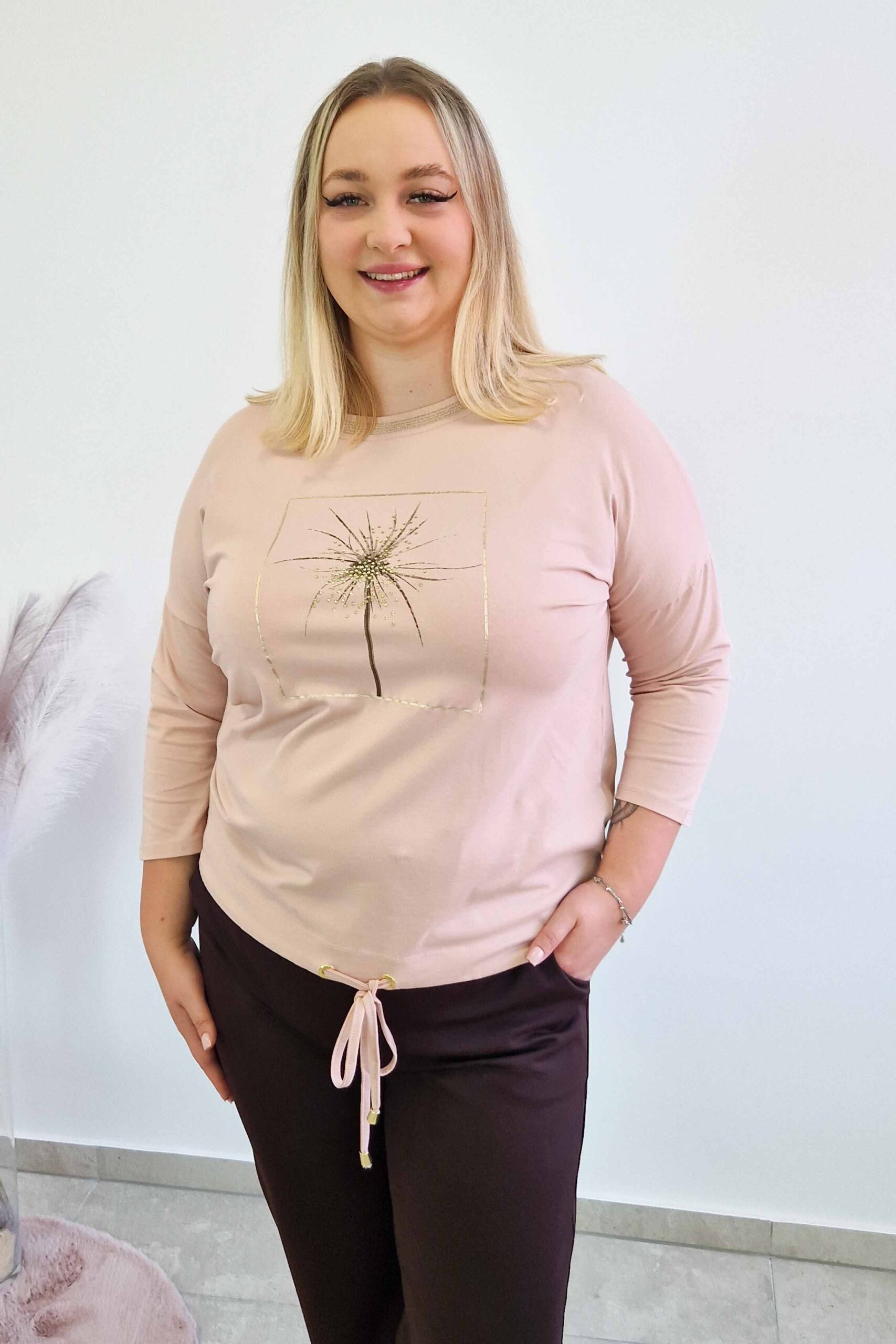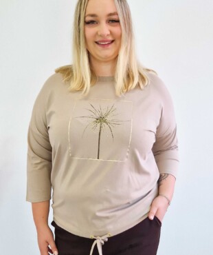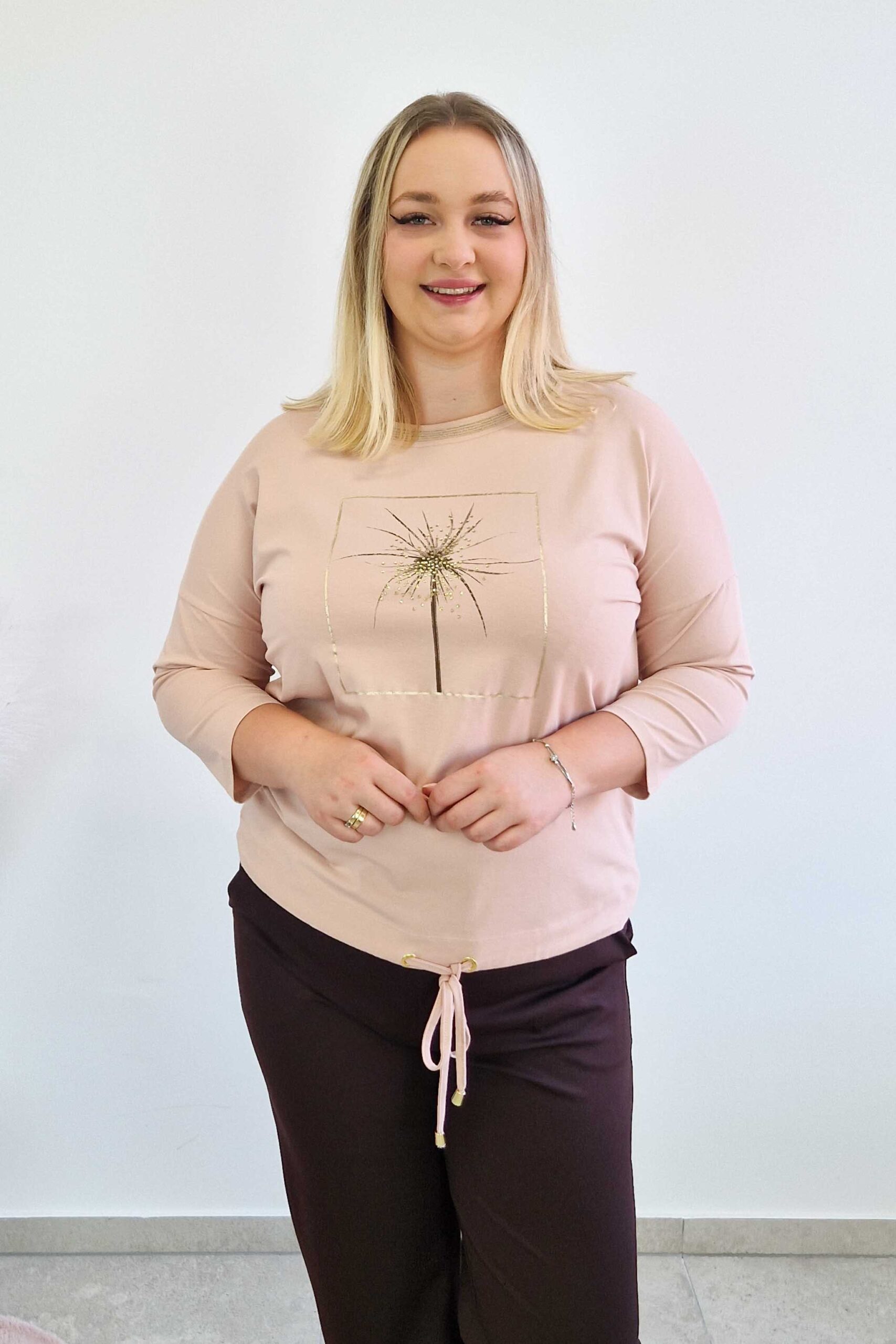 Wiązanie na dole pozwala dopasować fason do sylwetki, dzięki czemu bluzka prezentuje się lekko i kobieco. Motyw dmuchawca dodaje jej delikatności i romantycznego charakteru, a rękaw 3/4 sprawia, że świetnie sprawdza się o każdej porze roku.