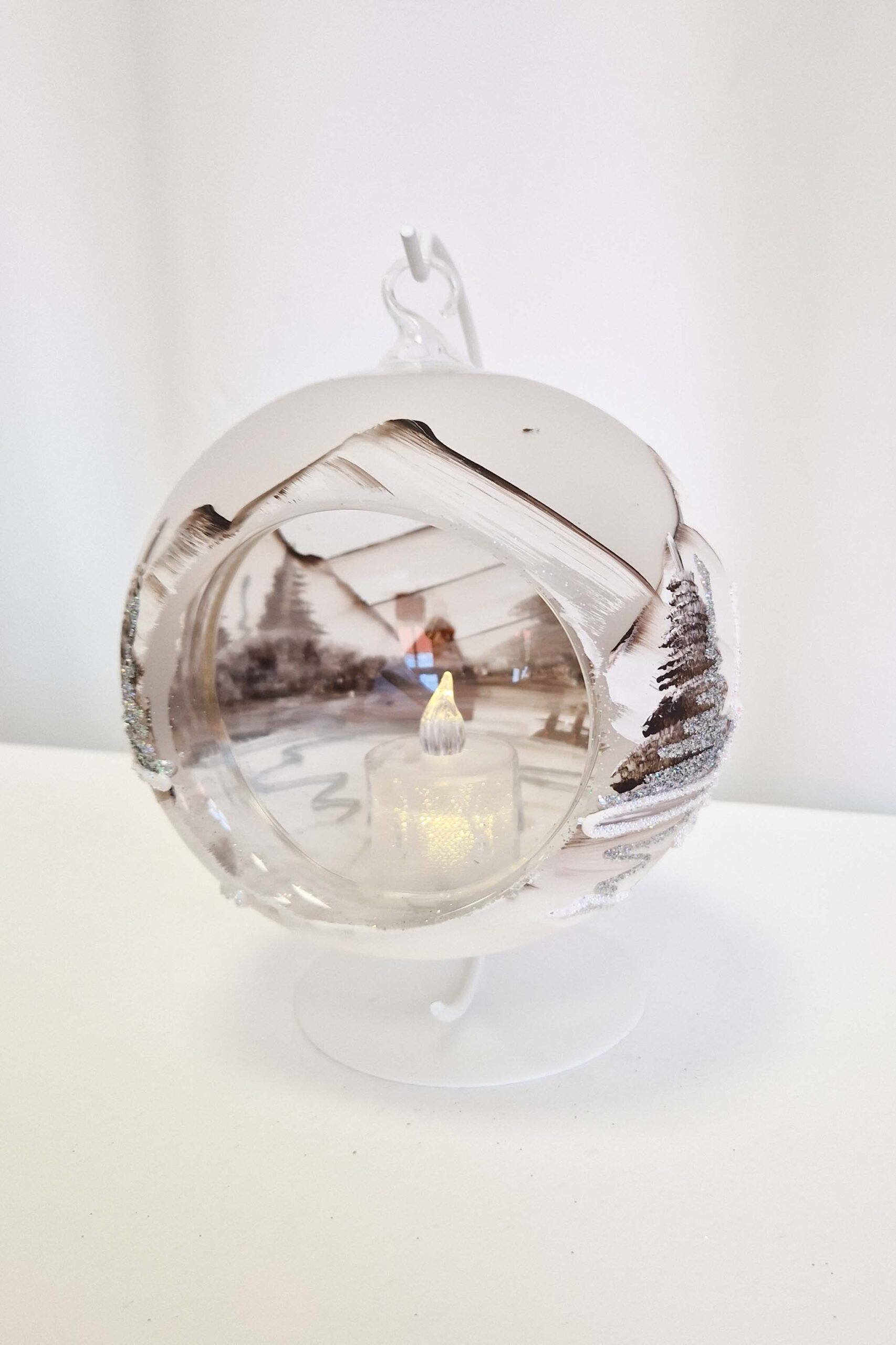 Bombka została zaprojektowana z wycięciem, które umożliwia umieszczenie wewnątrz świeczki tealight – zarówno klasycznej, jak i LED. Po zapaleniu świeczki, zimowy pejzaż rozświetla się ciepłym, przytulnym blaskiem, który nadaje wnętrzu nastrojowego charakteru podczas zimowych wieczorów. Dzięki tej funkcji, bombka nie tylko pięknie wygląda, ale także wprowadza wyjątkowy klimat do każdego pomieszczenia.