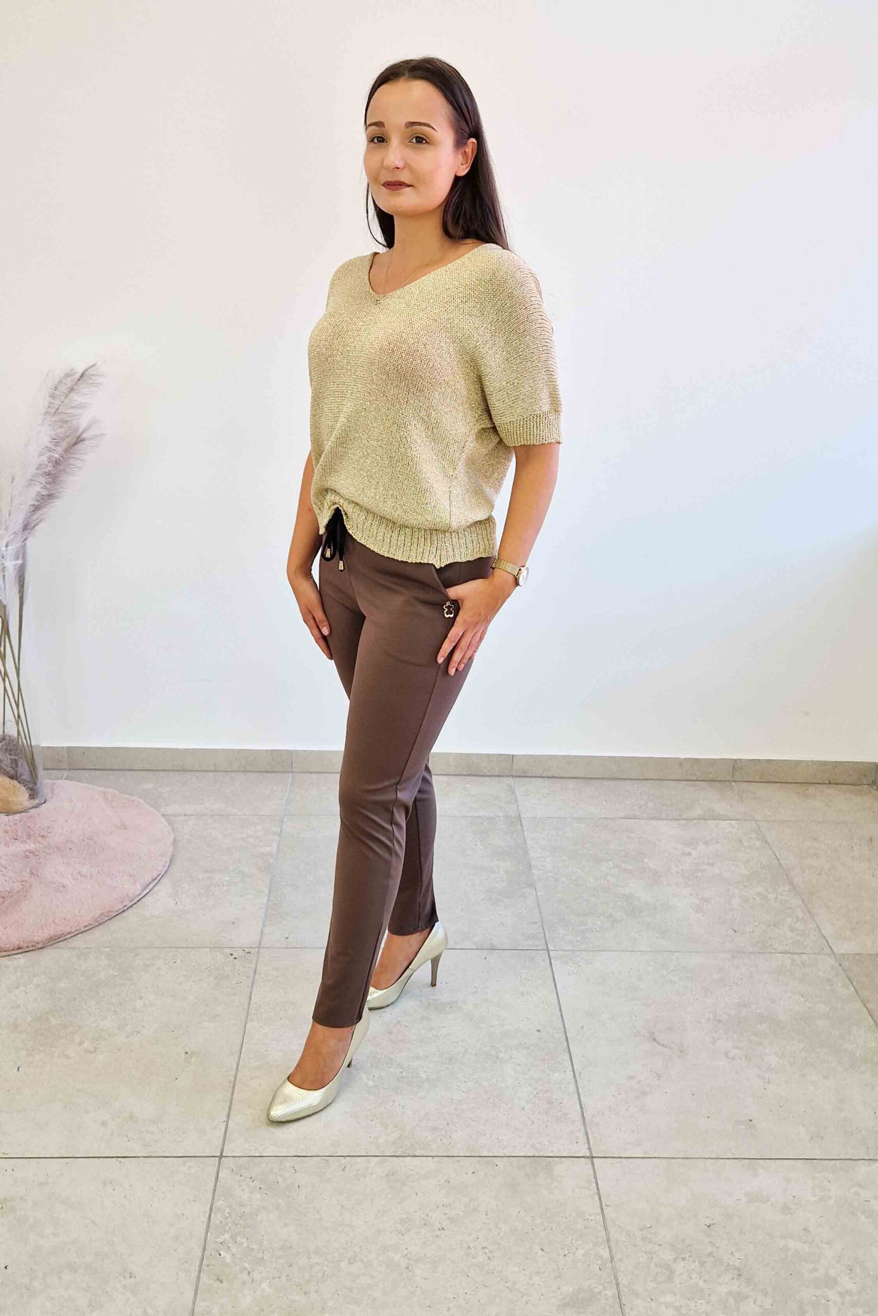 Dodaj blasku swojej szafie! Zamów już dziś ten złoty sweterek damski ze złotą nitką w szpic i ciesz się wyjątkowym stylem na każdą okazję!
