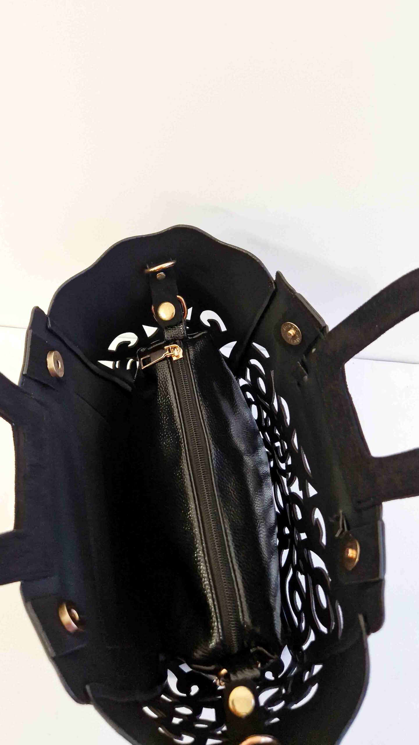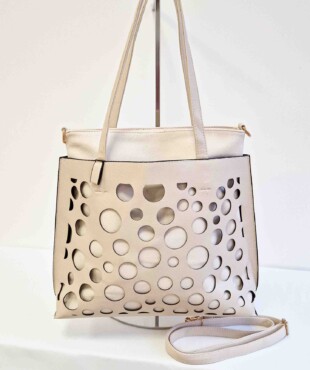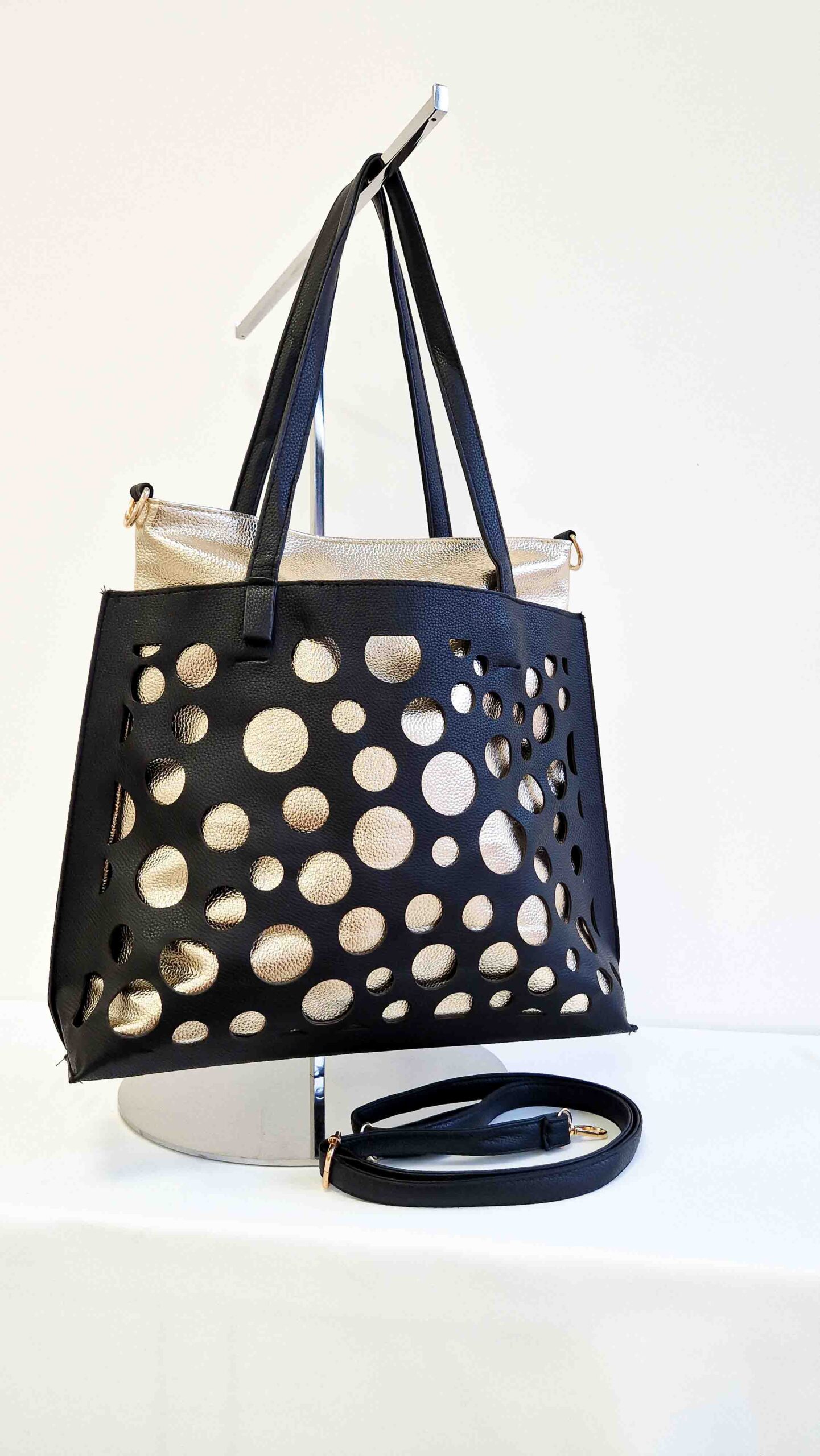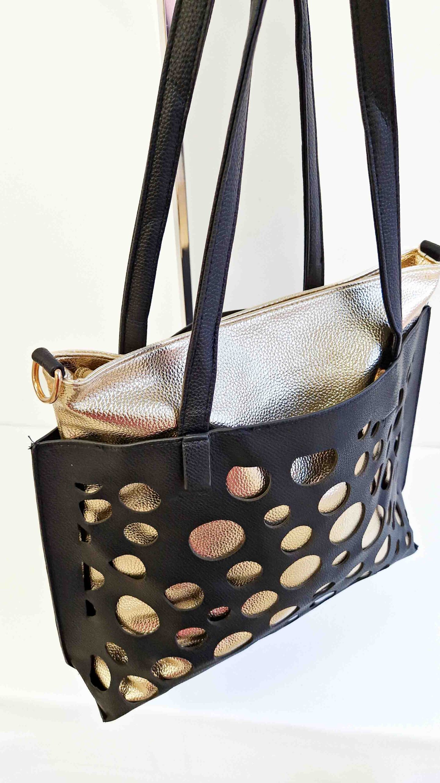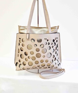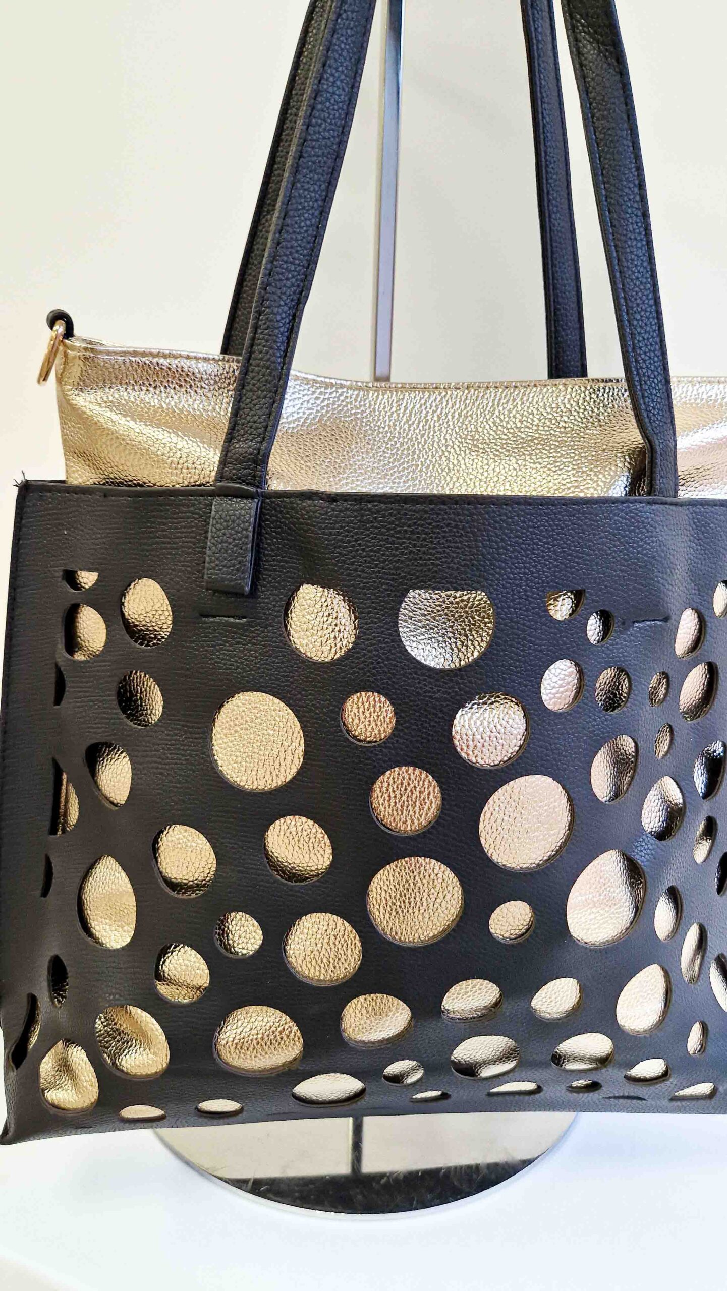 Dzięki unikalnemu połączeniu matowej eko-skóry z połyskującym, złotym wnętrzem, ta torebka zyskuje niezwykle nowoczesny i luksusowy charakter. Wycinany, ażurowy wzór nadaje jej lekkości, a złote przebłyski sprawiają, że jest to idealna torebka na lato oraz na wszelkie wyjścia, gdzie chcesz dodać swojej stylizacji blasku. Świetnie sprawdzi się na co dzień, na zakupy czy spotkanie przy kawie, przyciągając wzrok swoją oryginalną fakturą.