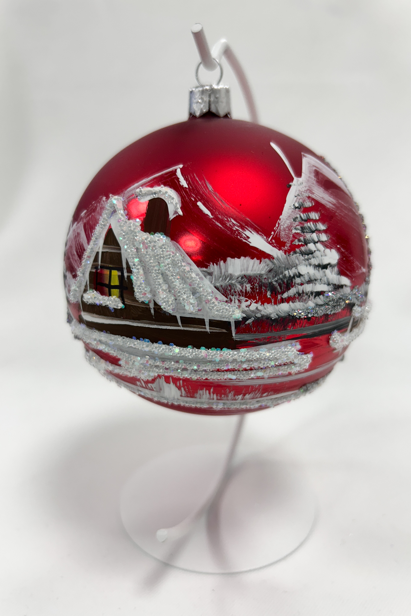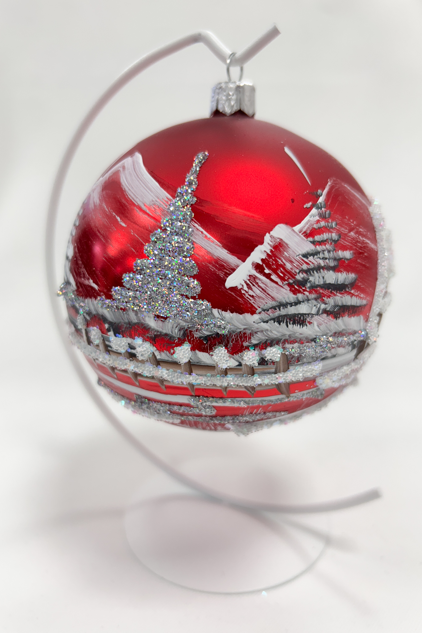 Czerwona Ręcznie Malowana Bombka z Zimowym Pejzażem na Stojaku 80