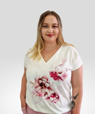 Model Dona ma luźniejszy krój, idealny dla rozmiarów plus size (od 40 do 48), zapewniając wygodę oraz swobodę ruchów. Subtelny kwiatowy wzór na białym tle nadaje jej kobiecego charakteru i sprawia, że stylizacja zyskuje lekkości i wdzięku. Dodatkowym atutem są podpinane rękawy, które pozwalają na noszenie koszuli na dwa sposoby – z długim rękawem lub podwiniętym do łokcia, co umożliwia dostosowanie jej wyglądu do pory roku i okazji.