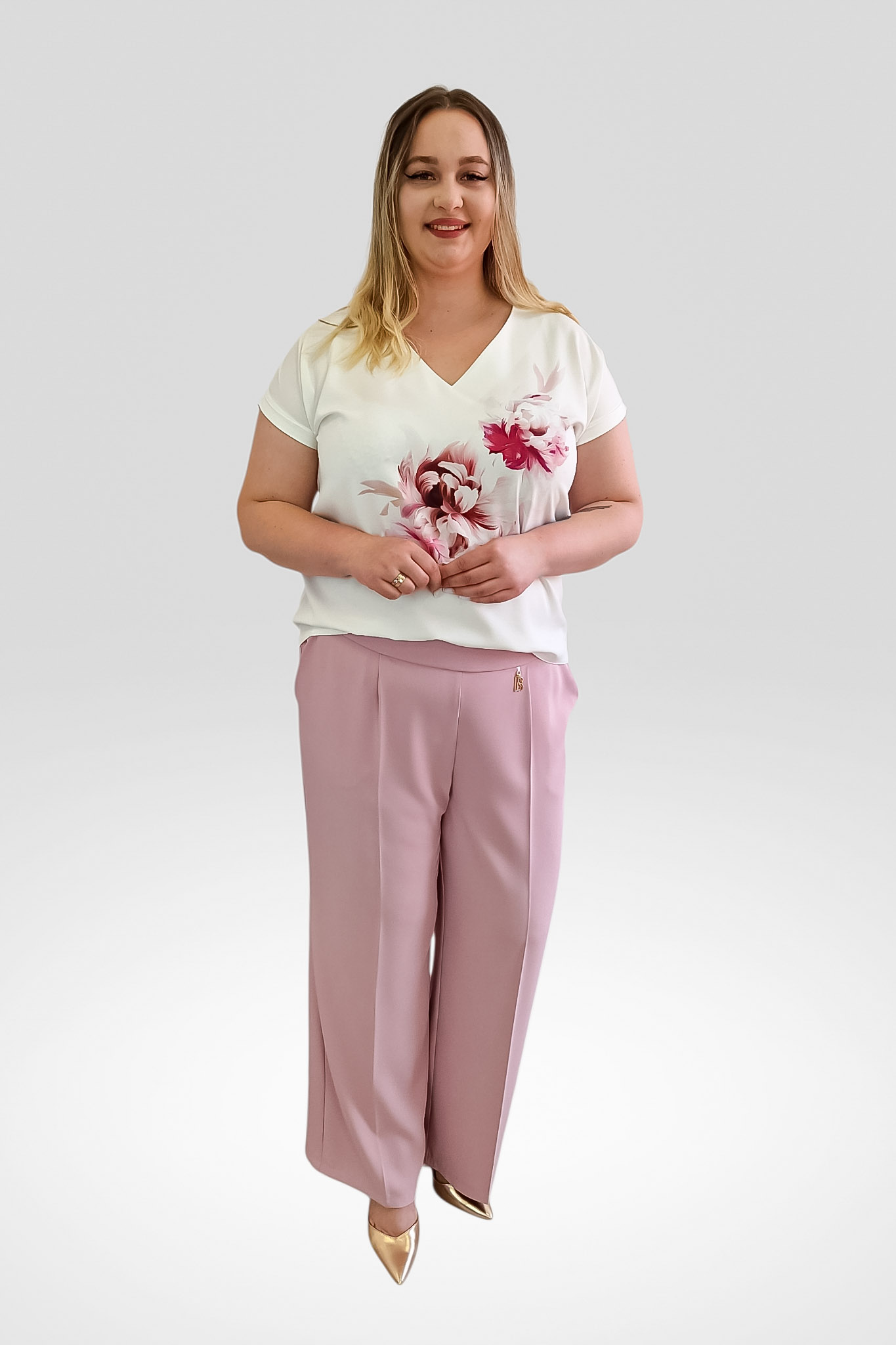 Model Dona ma luźniejszy krój, idealny dla rozmiarów plus size (od 40 do 48), zapewniając wygodę oraz swobodę ruchów. Subtelny kwiatowy wzór na białym tle nadaje jej kobiecego charakteru i sprawia, że stylizacja zyskuje lekkości i wdzięku. Dodatkowym atutem są podpinane rękawy, które pozwalają na noszenie koszuli na dwa sposoby – z długim rękawem lub podwiniętym do łokcia, co umożliwia dostosowanie jej wyglądu do pory roku i okazji.