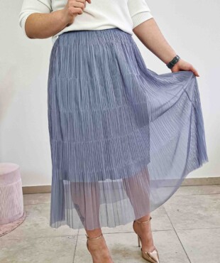 Ta plisowana spódnica maxi to propozycja dla kobiet ceniących subtelną elegancję i lekkość w codziennych stylizacjach. Wykonana z transparentnej siateczki o gęstym plisowaniu, spódnica pięknie układa się podczas ruchu, nadając sylwetce eterycznego wyrazu. Charakterystyczne poziome segmenty wprowadzają nowoczesny element ozdobny, który wyróżnia ten model na tle klasycznych spódnic tiulowych.