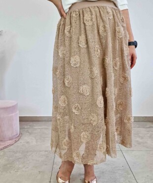 Niezwykle efektowna i kobieca spódnica maxi, która zachwyca unikalną strukturą. Wierzchnia warstwa wykonana z delikatnej siateczki została ozdobiona przestrzennymi różami 3D, co nadaje całości luksusowego i romantycznego charakteru.