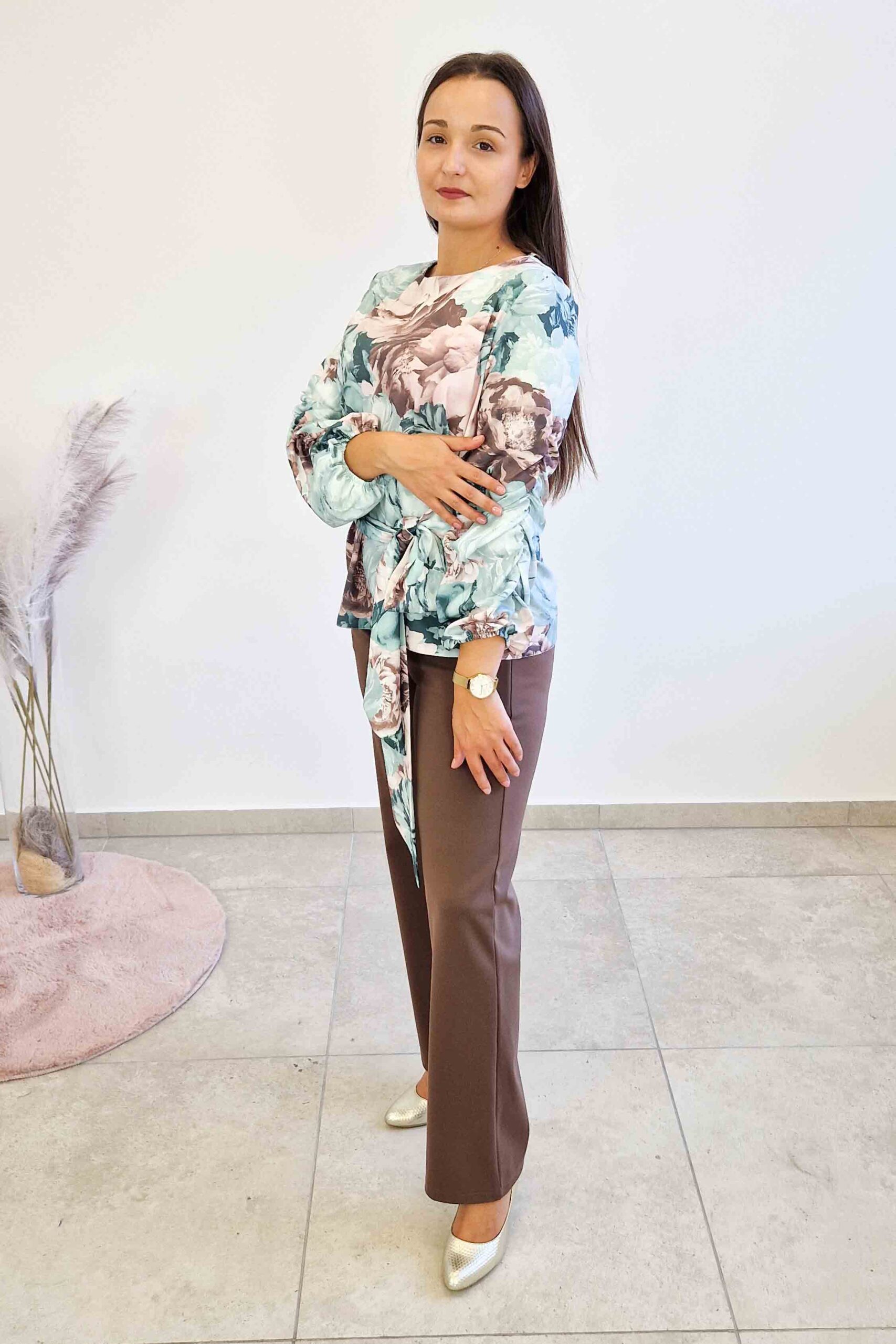 Wiązanie w pasie to nie tylko element dekoracyjny, ale także funkcjonalny – pozwala na zdefiniowanie sylwetki i stworzenie efektu klepsydry. Tę elegancką bluzkę w kwiaty możesz zestawiać z materiałowymi spodniami do pracy lub klasycznymi jeansami na weekend. Doskonale będzie wyglądać również ze spódnicą ołówkową i eleganckimi butami na obcasie, tworząc idealną kreację do biura czy na wieczorne wyjście. To bluzka, która łatwo się stylizuje, dając Ci mnóstwo możliwości do eksperymentowania z modą. Jest to prawdziwa modna bluzka damska, która doda elegancji każdej Twojej stylizacji.