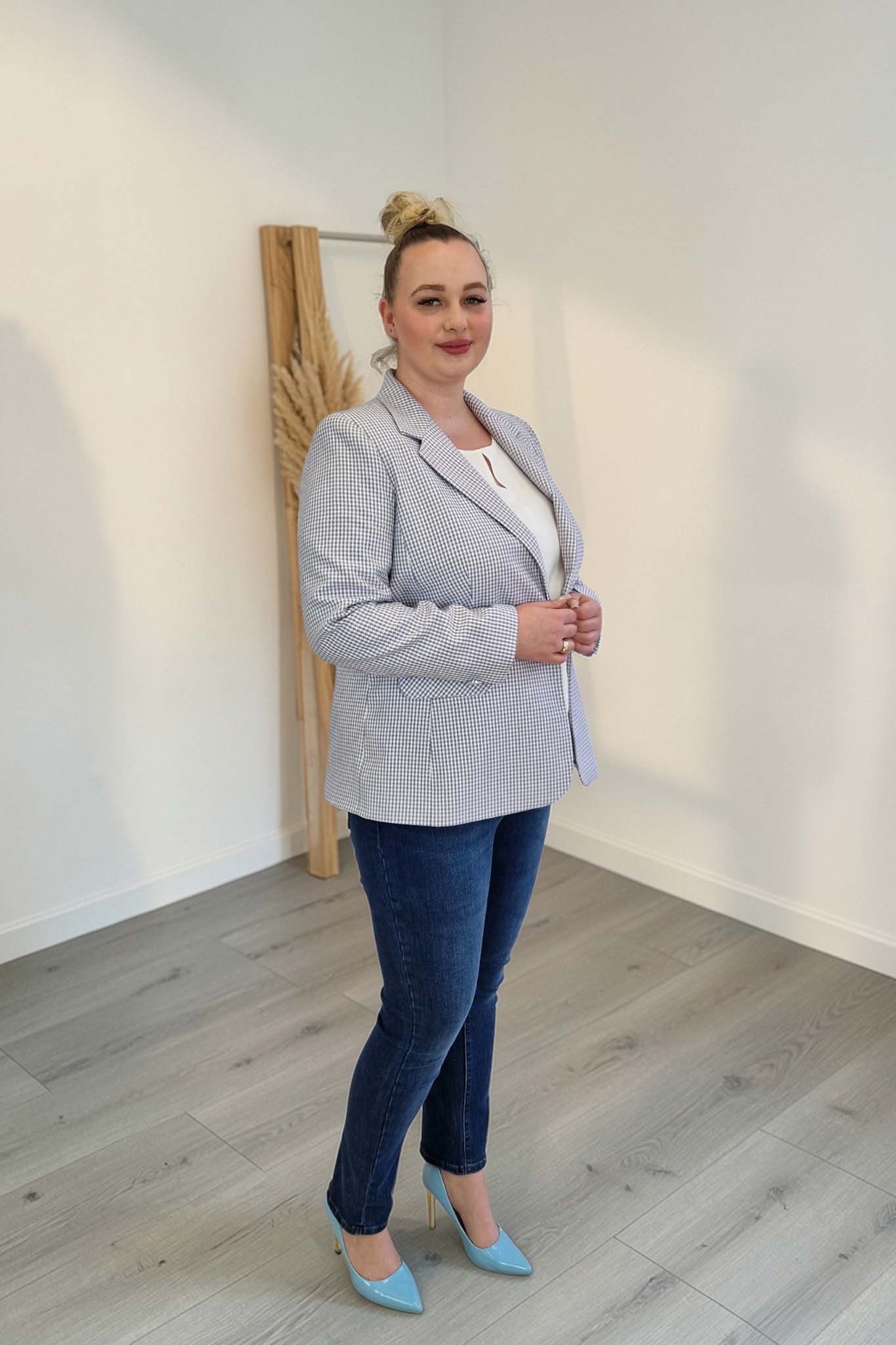 Bez problemu zestawisz ją z białą koszulą i jeansami, tworząc smart casualowy look, albo założysz na zwiewną sukienkę w jednolitym kolorze, by dodać jej charakteru. Świetnie wygląda również z mokasynami, sneakersami, a nawet letnimi sandałami – to elegancka marynarka damska, która pasuje do wielu stylizacji.