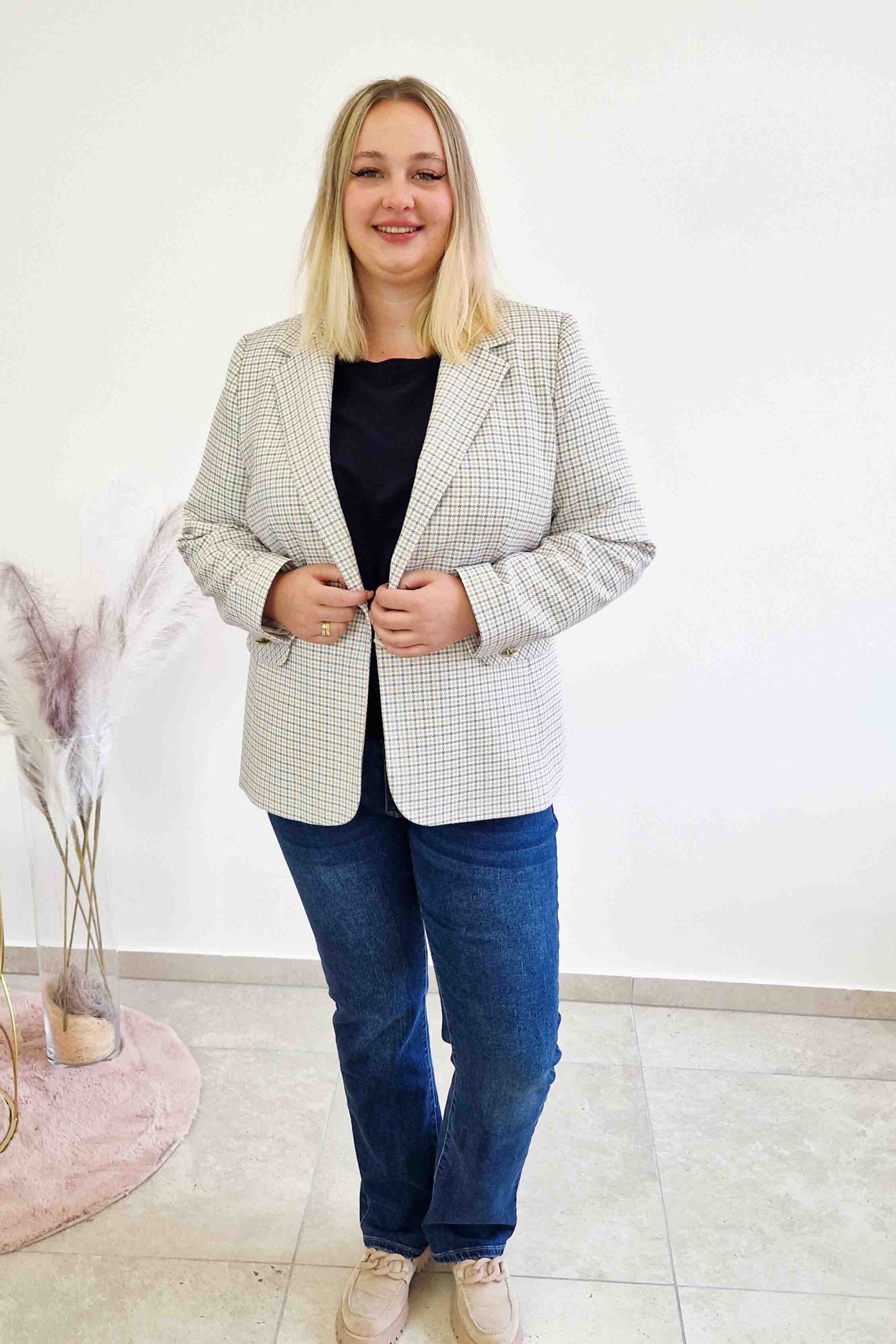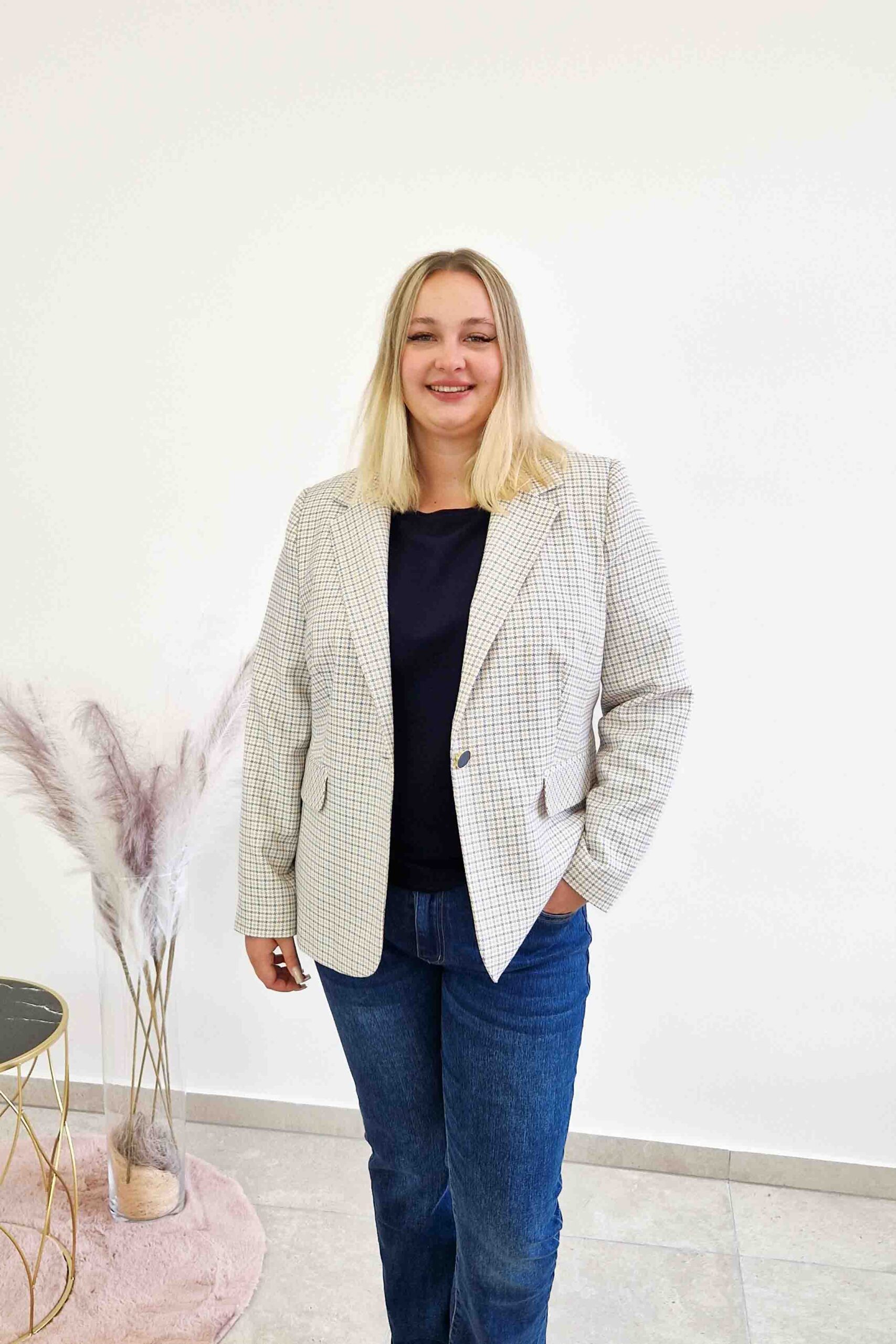 Napisz pierwszą opinię o „Elegancka Marynarka w Kratę Damska Beżowo-Granatowa”