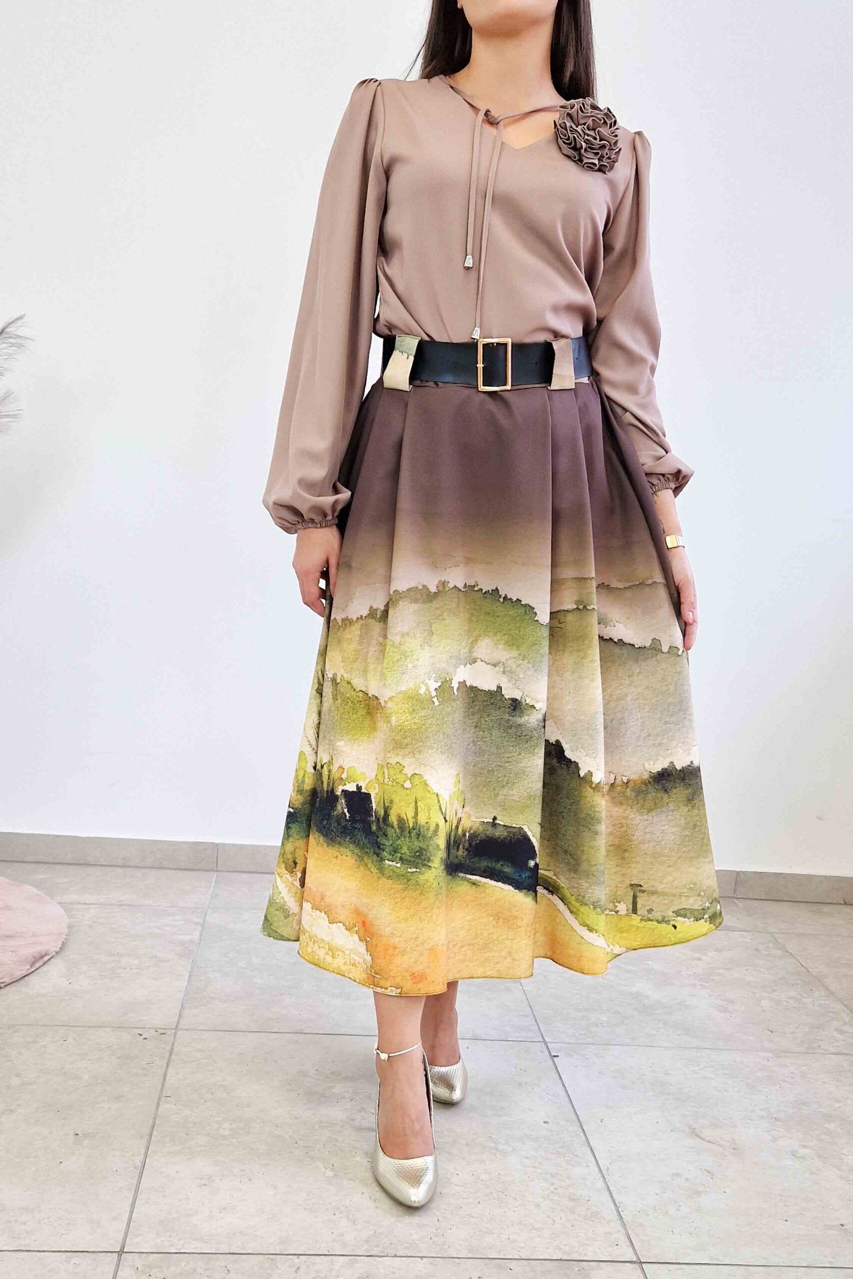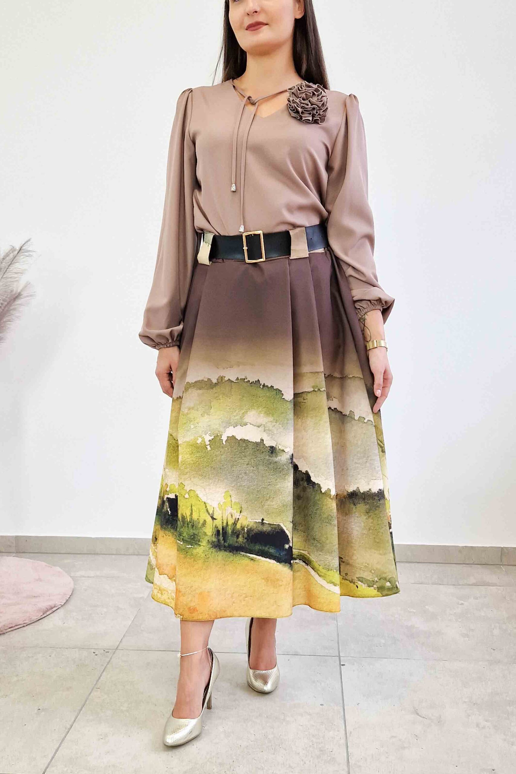 Ta długa spódnica ze wzorami to idealny wybór na co dzień, jak i na bardziej eleganckie wyjścia. Dostępna w 4 modnych wzorach – zygzak czarno-beżowy, fale czekoladowo-beżowe, pejzaż oraz picasso – z łatwością dopasujesz ją do swojego stylu. Zapewniająca łatwe stylizowanie i niezwykłą wygodę, stanie się Twoją ulubioną spódnicą na jesień.