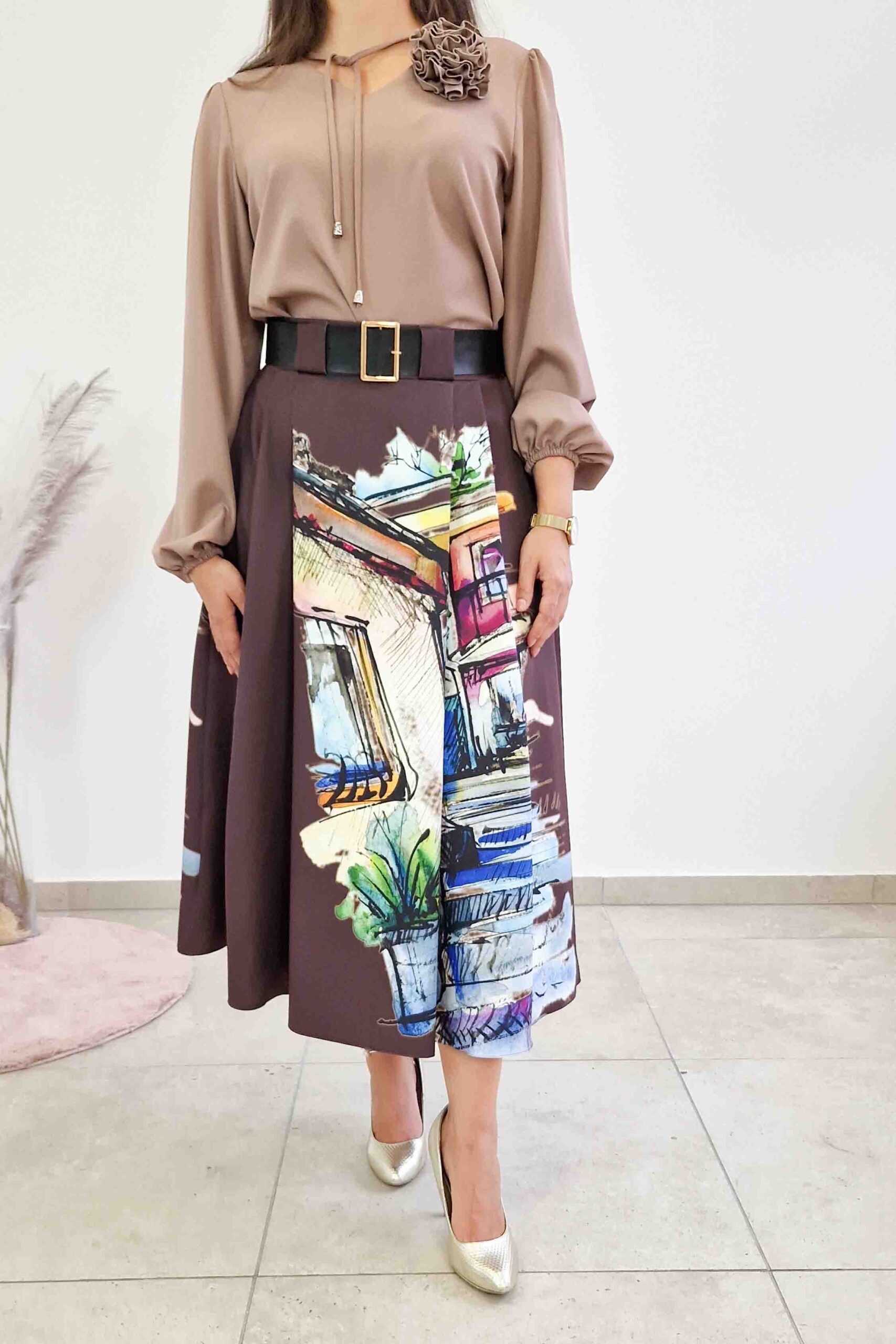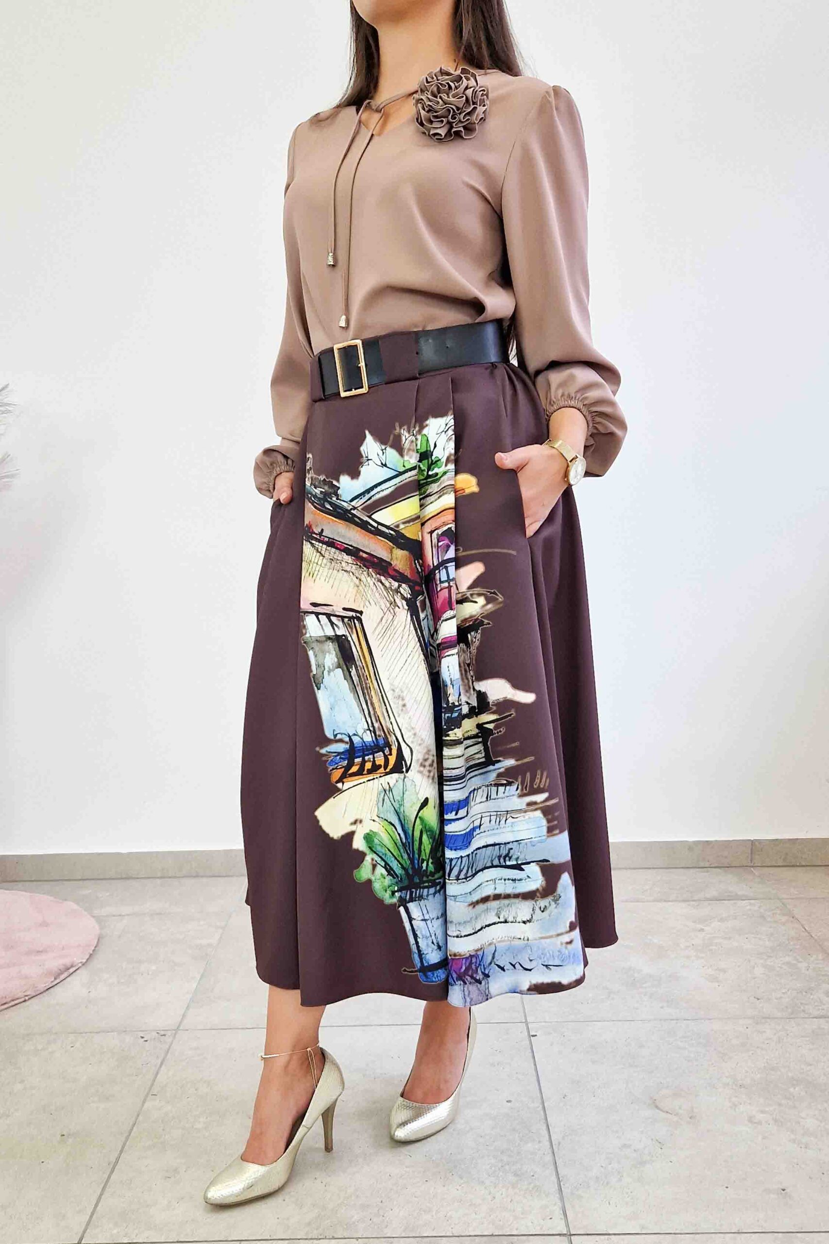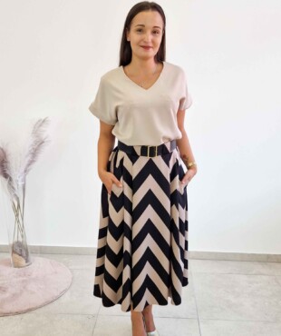 Ta długa spódnica ze wzorami to idealny wybór na co dzień, jak i na bardziej eleganckie wyjścia. Dostępna w 4 modnych wzorach – zygzak czarno-beżowy, fale czekoladowo-beżowe, pejzaż oraz picasso – z łatwością dopasujesz ją do swojego stylu. Zapewniająca łatwe stylizowanie i niezwykłą wygodę, stanie się Twoją ulubioną spódnicą na jesień.