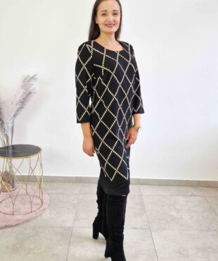 Ta czarno-beżowa sukienka midi to kwintesencja elegancji w nowoczesnym wydaniu. Wykonana z przyjemnego w dotyku materiału z domieszką elastanu, pięknie dopasowuje się do sylwetki, podkreślając talię i zapewniając komfort noszenia przez cały dzień. Wzór glamour w delikatnym wydaniu dodaje jej wyjątkowego charakteru — idealnie sprawdzi się zarówno w biurze, jak i podczas rodzinnych spotkań.