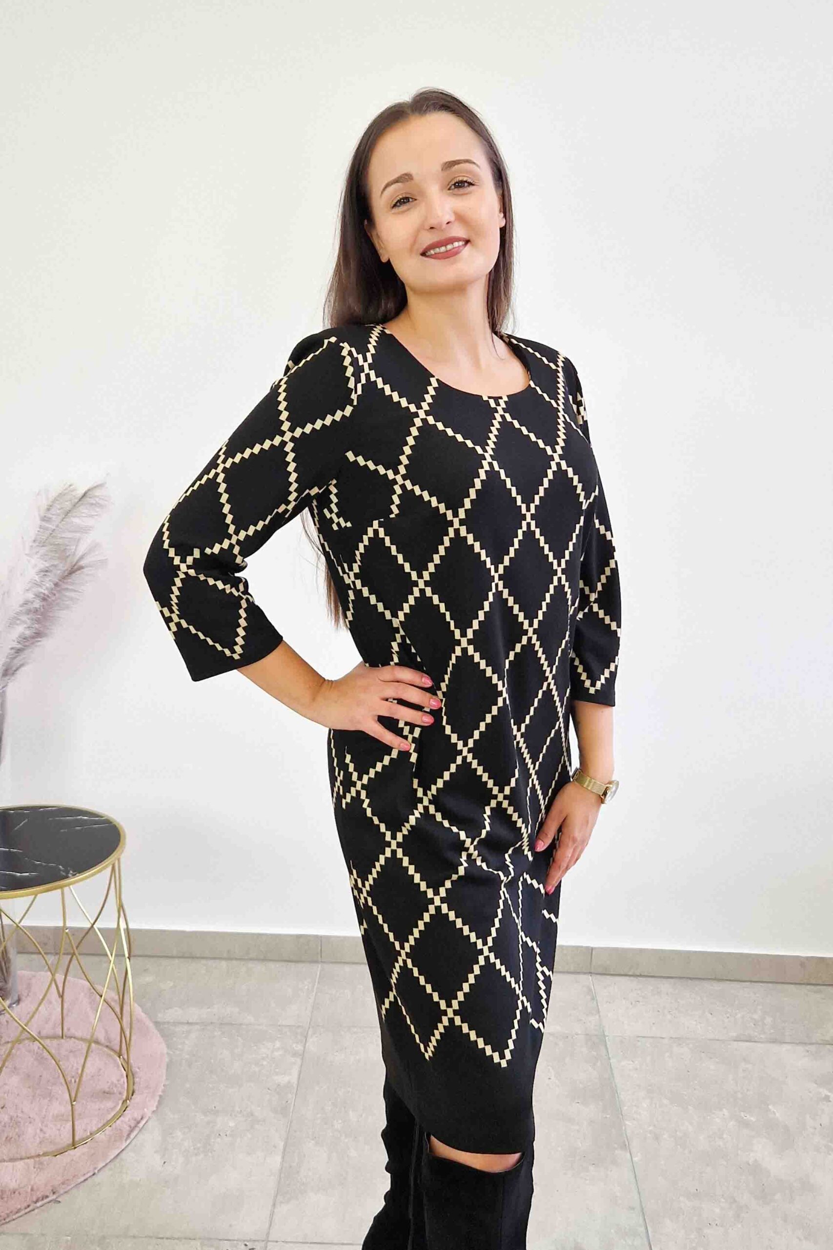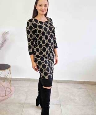 Ta czarno-beżowa sukienka midi to kwintesencja elegancji w nowoczesnym wydaniu. Wykonana z przyjemnego w dotyku materiału z domieszką elastanu, pięknie dopasowuje się do sylwetki, podkreślając talię i zapewniając komfort noszenia przez cały dzień. Wzór glamour w delikatnym wydaniu dodaje jej wyjątkowego charakteru — idealnie sprawdzi się zarówno w biurze, jak i podczas rodzinnych spotkań.