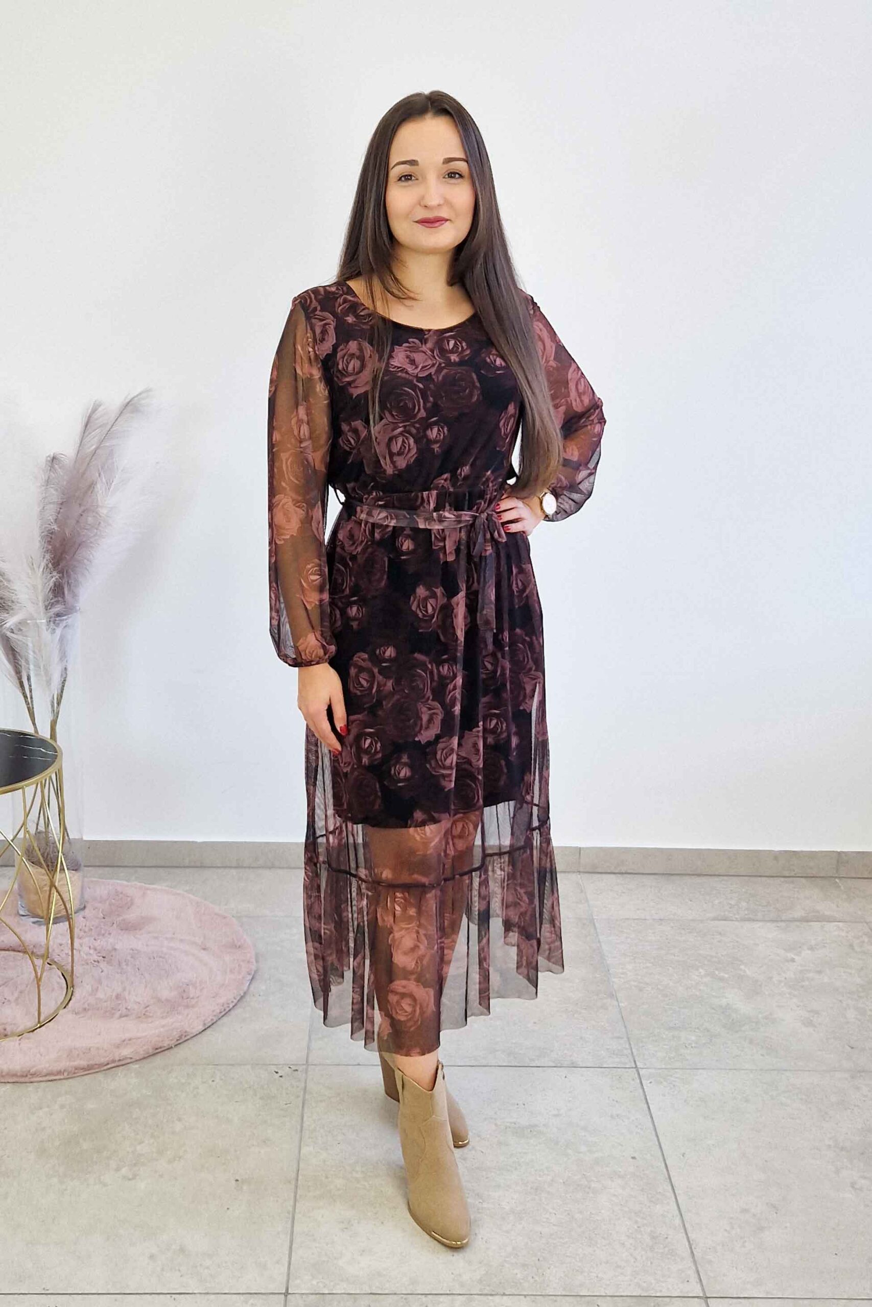 Elegancka Sukienka w Róże z Siatki Czekoladowa