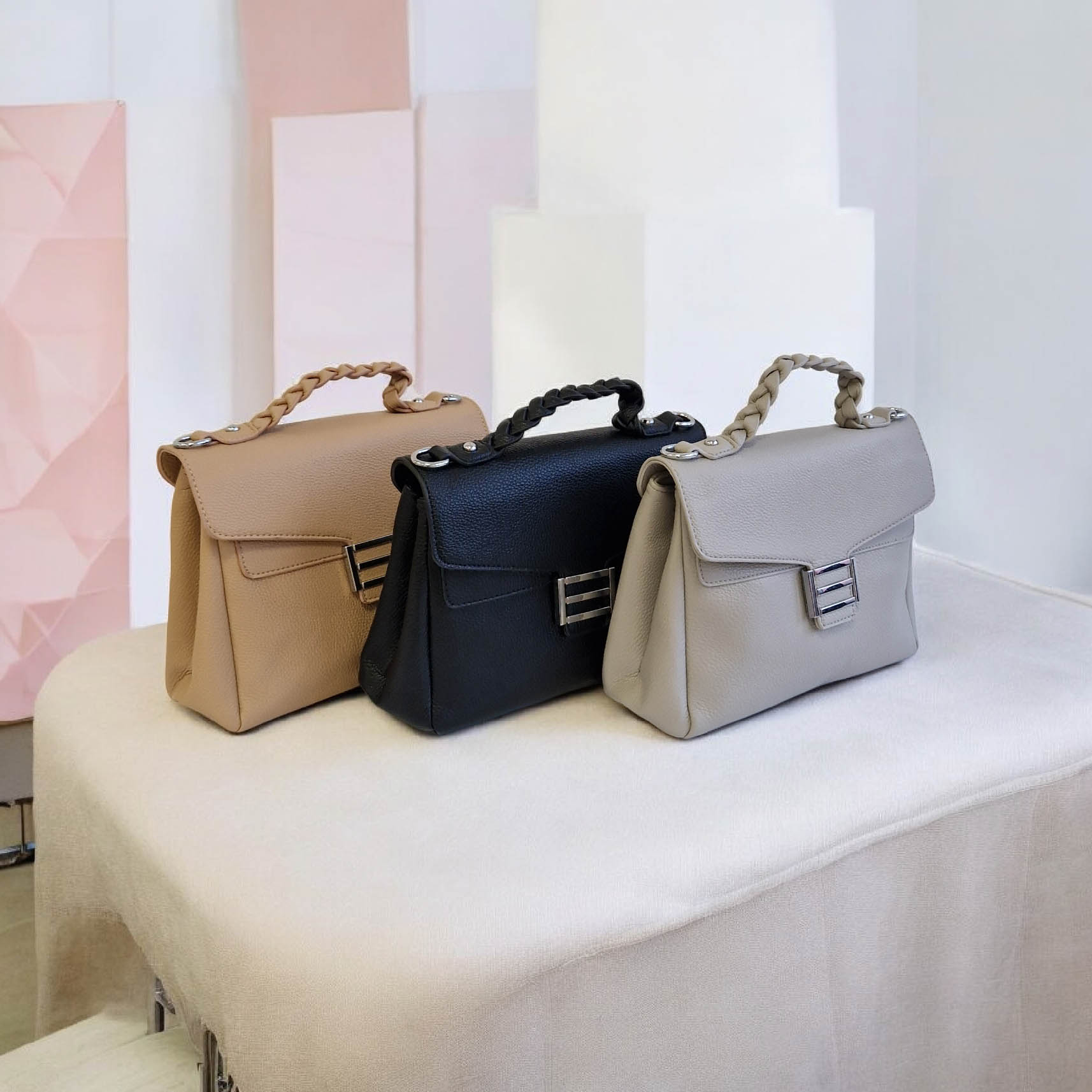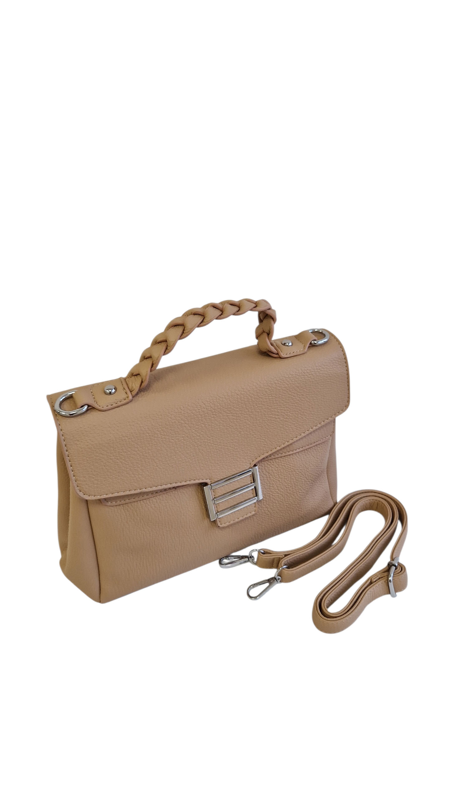 Wykonana z trwałej skóry eko, ta modna torebka z klapą świetnie trzyma swoją formę i jest odporna na codzienne użytkowanie. Przy kompaktowych wymiarach, model ten nie mieści formatu A4, ale oferuje wystarczająco dużo miejsca na wszystkie kobiece niezbędniki. Możesz nosić ją w ręku za pleciony uchwyt lub skorzystać z doczepianego paska, by swobodnie przewiesić ją przez ramię. Dostępna w trzech ponadczasowych kolorach: klasycznej czerni, subtelnym beżu oraz stylowym popielu.