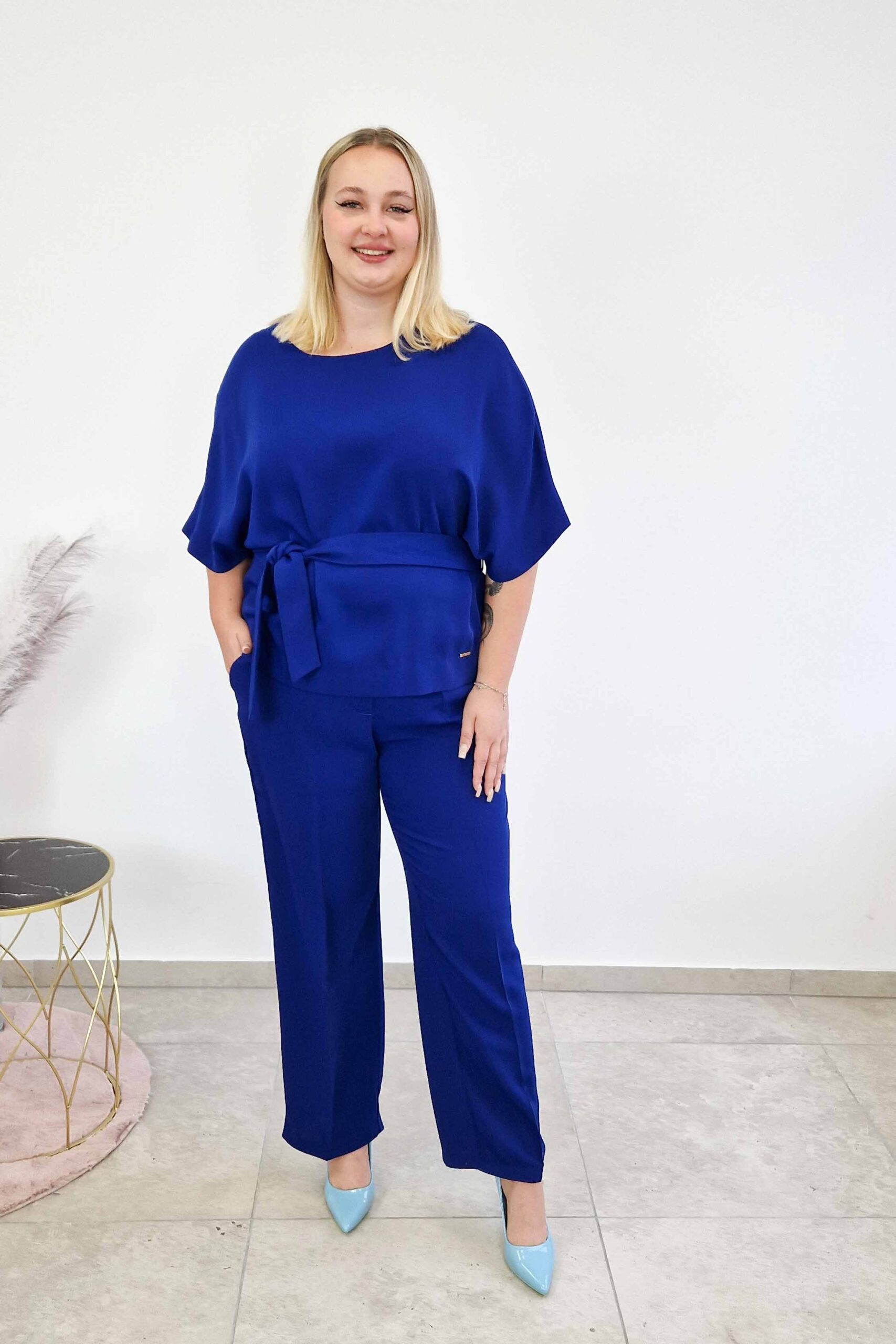 Lekko oversize’owa bluzka kimono z wiązaniem w pasie pięknie podkreśla talię, a spodnie z gumką z tyłu zapewniają swobodę ruchów i idealne dopasowanie do sylwetki. Ten komplet chabrowy to wybór dla kobiet, które cenią styl i wygodę w jednym. Ten damski komplet z wiskozy to idealna propozycja dla kobiet, które lubią wyglądać stylowo bez wysiłku. Bluzka z wiązaniem w pasie subtelnie modeluje sylwetkę i pozwala dopasować fason do własnych preferencji, a spodnie z wyższym stanem i elastycznym tyłem gwarantują wygodę przez cały dzień. Wiskoza sprawia, że komplet jest lekki, miękki i przyjemny w dotyku, a jednocześnie prezentuje się bardzo elegancko.