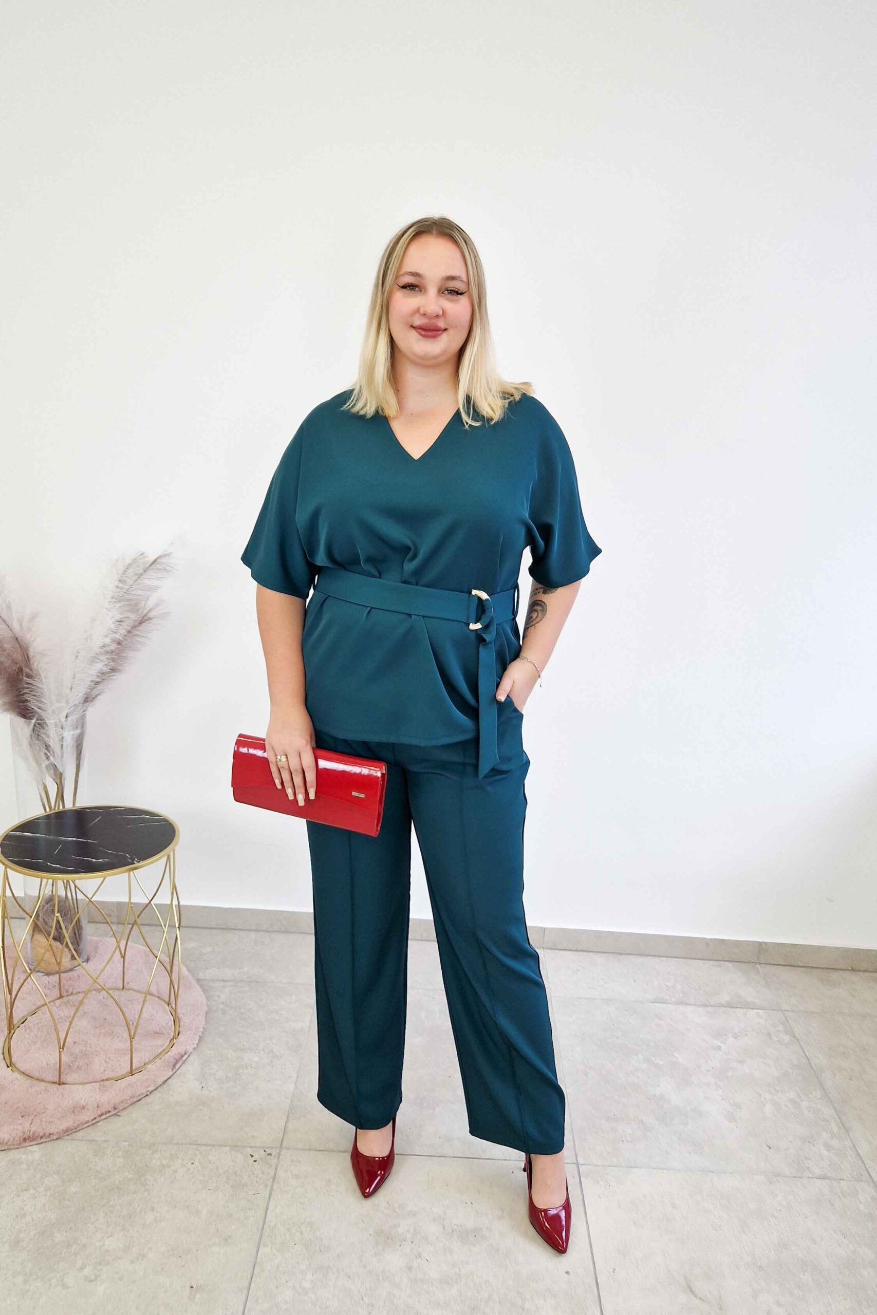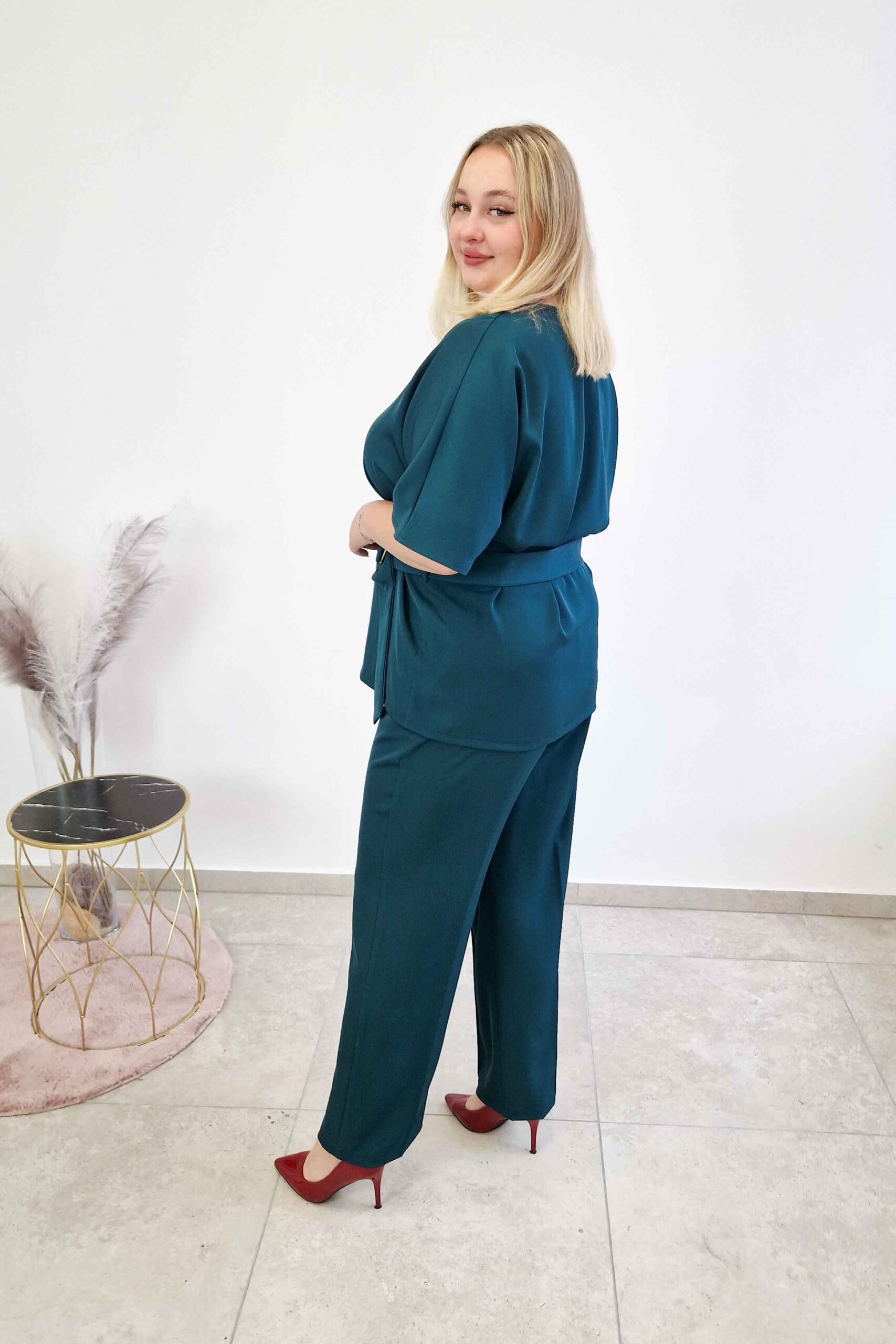 Bluzka kimono z dekoltem V prezentuje się lekko i stylowo, a pasek z klamrą pozwala wyeksponować talię, dodając sylwetce proporcji. Ten elegancki komplet w butelkowej zieleni to świetna alternatywa dla sukienki – sprawdzi się w biurze, na rodzinnych uroczystościach czy wyjściach do miasta.
