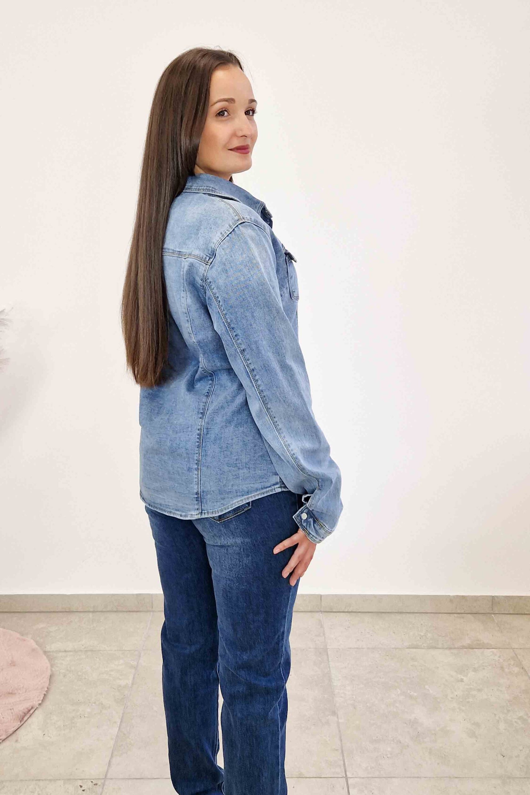 Ta niebieska koszula jeansowa damska to idealna baza do codziennych stylizacji. Naturalna bawełna w składzie sprawia, że materiał jest przewiewny i miły w dotyku, a dodatek elastanu gwarantuje swobodę ruchów i wygodę noszenia przez cały dzień. Koszula z długim rękawem dobrze sprawdza się zarówno noszona samodzielnie, jak i jako narzutka na top czy t-shirt.