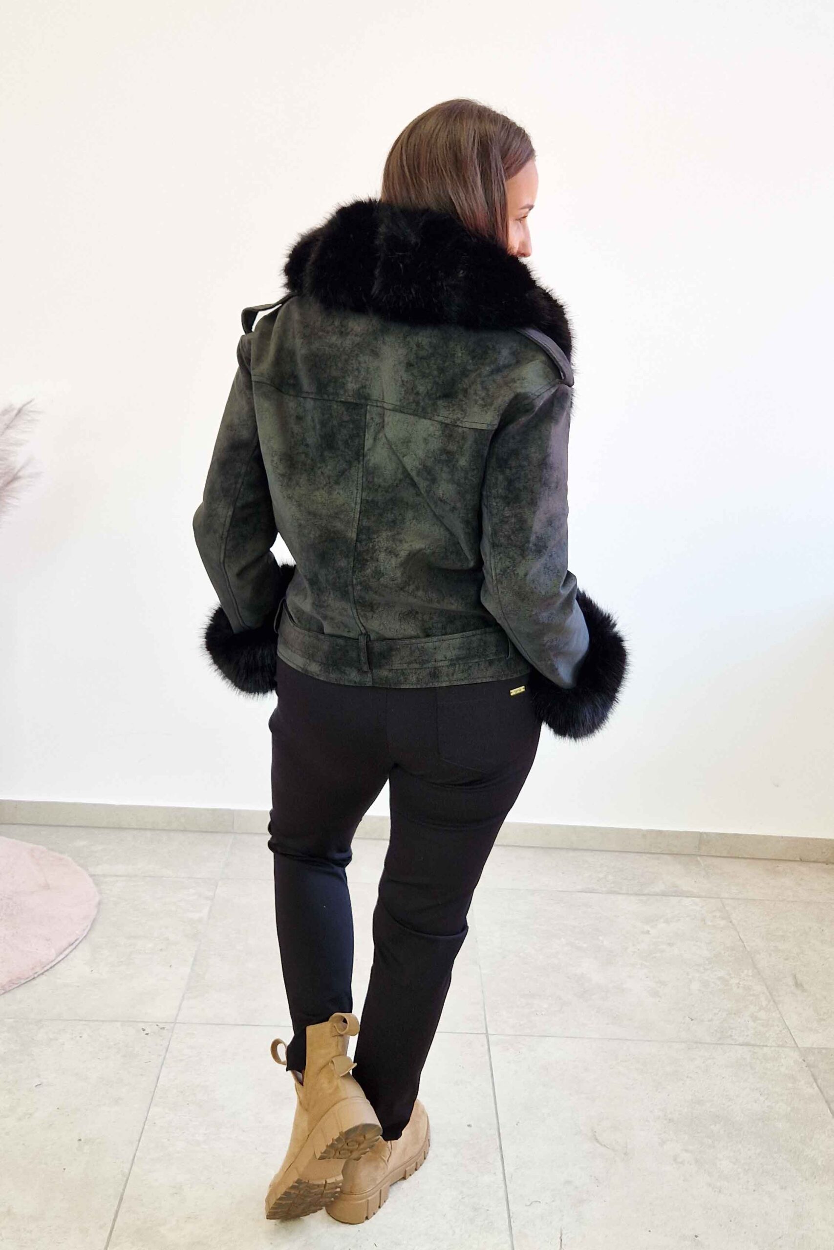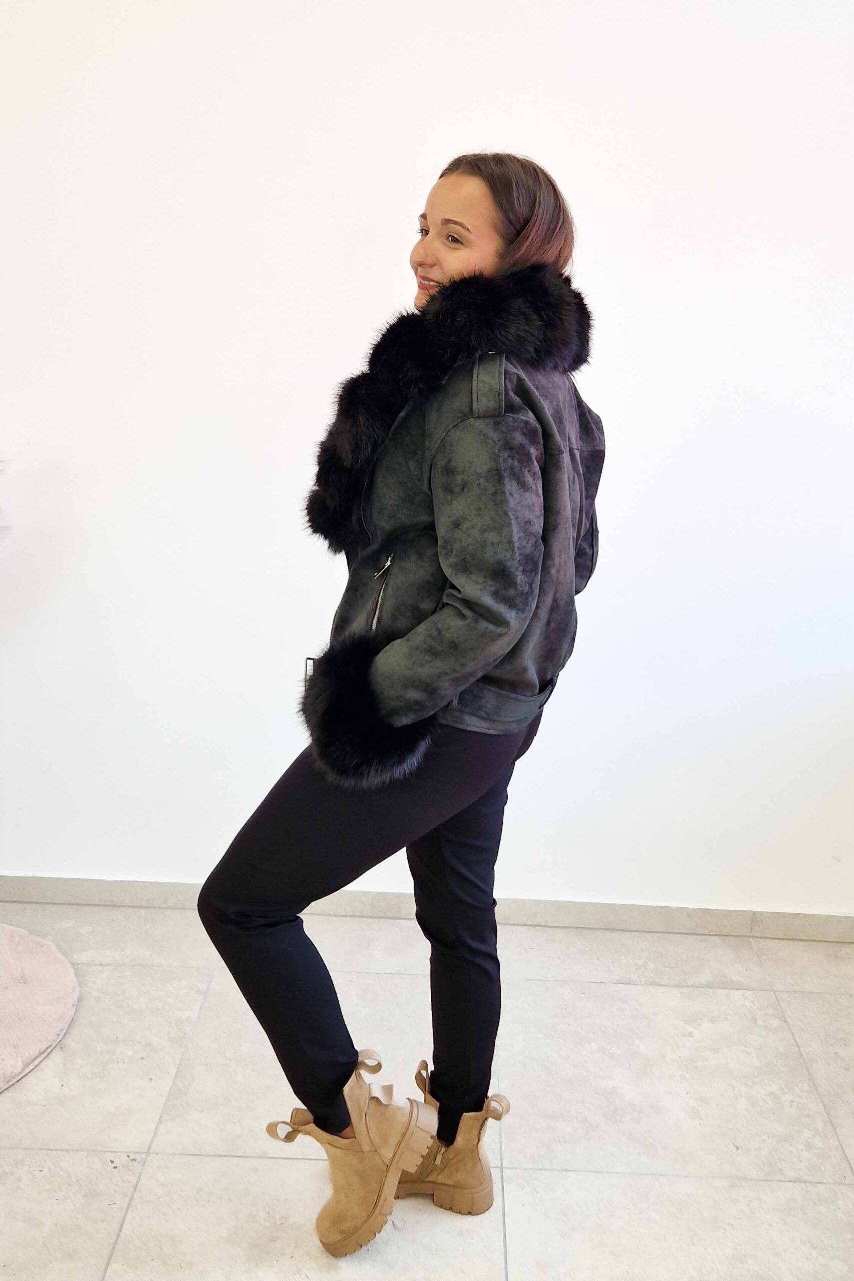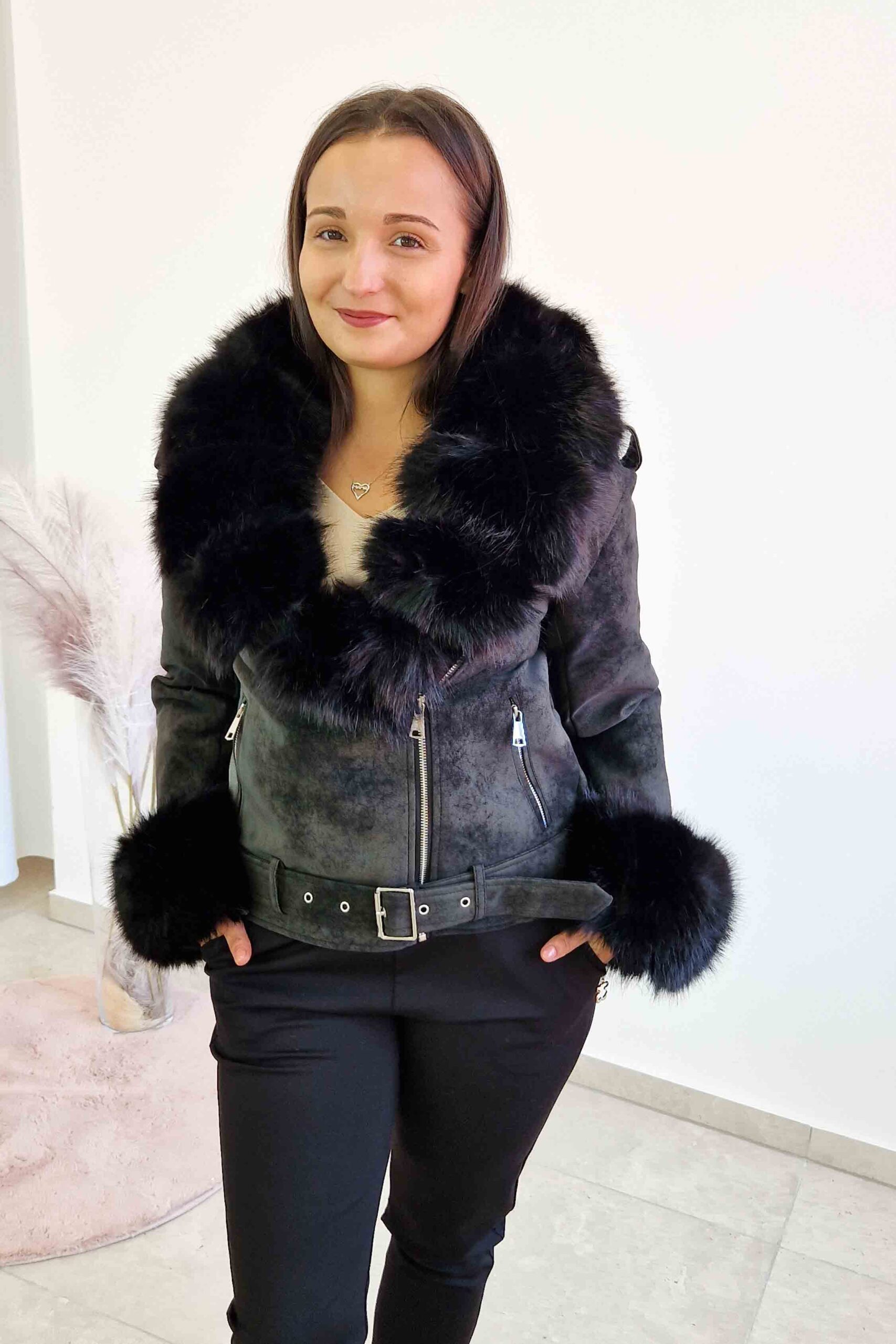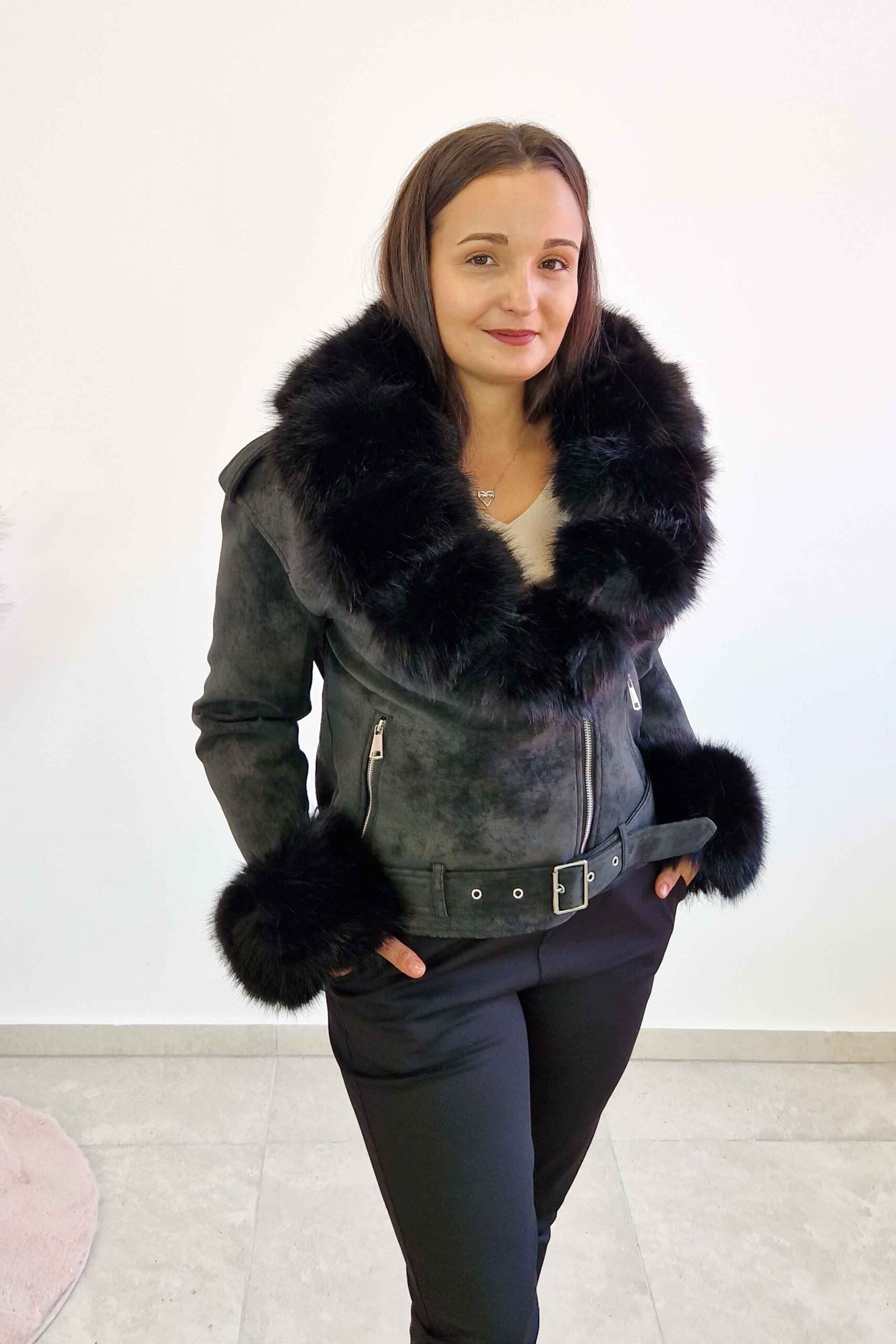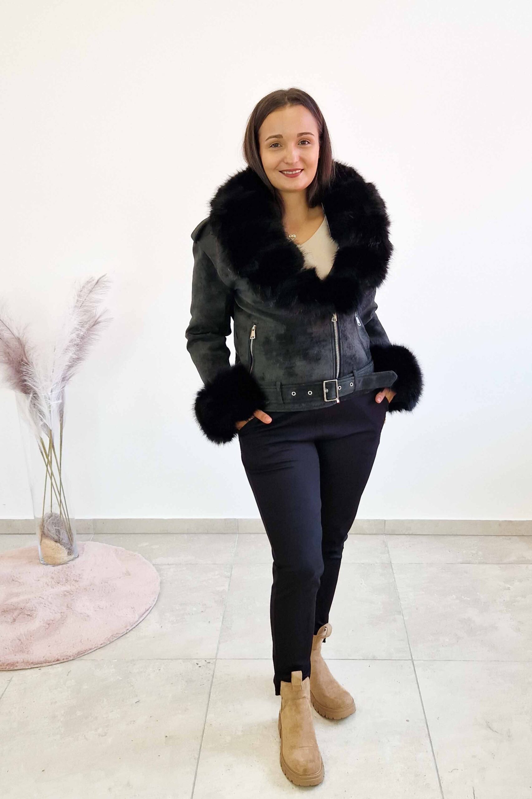 Klasyczna czarna ramoneska została wzbogacona o efektowne sztuczne futro na kołnierzu i rękawach, które dodaje całości elegancji i modowego charakteru. To idealna kurtka na jesień, która sprawdzi się zarówno w codziennych, jak i bardziej kobiecych stylizacjach.