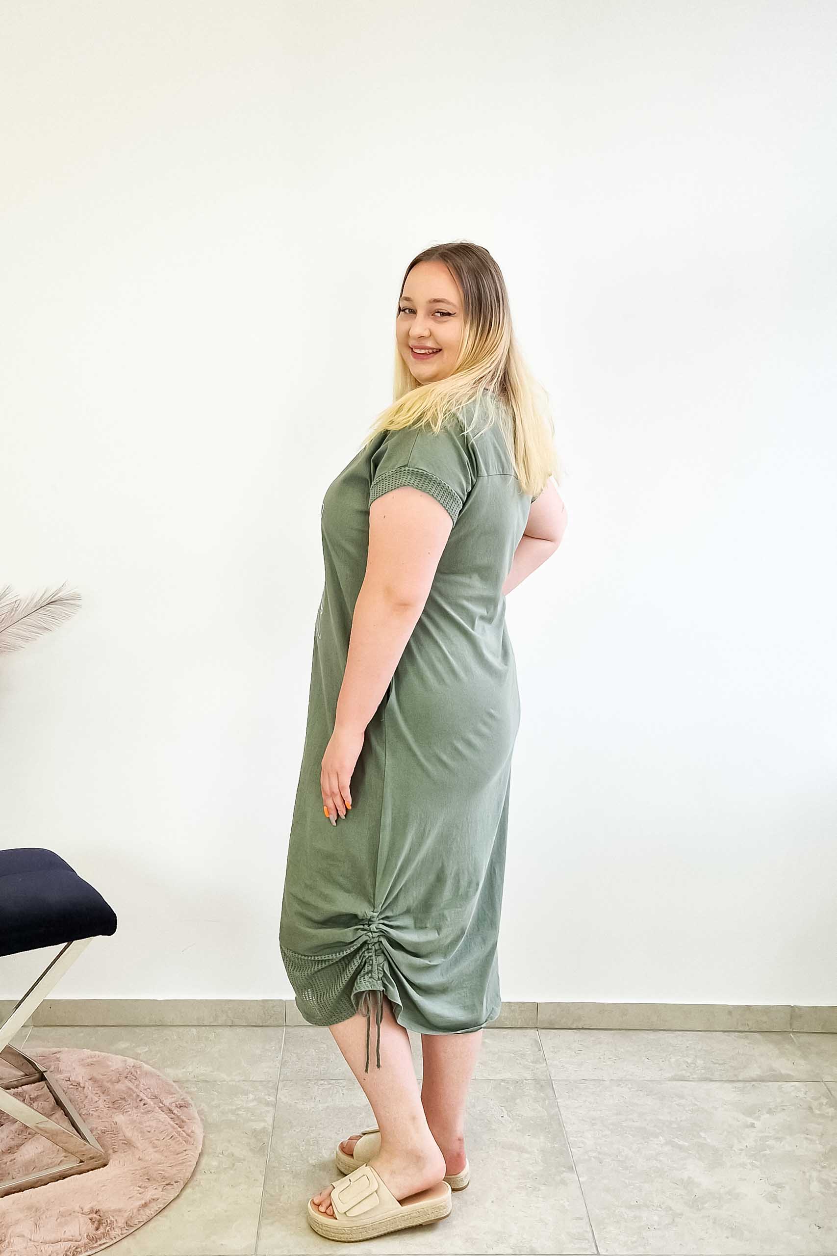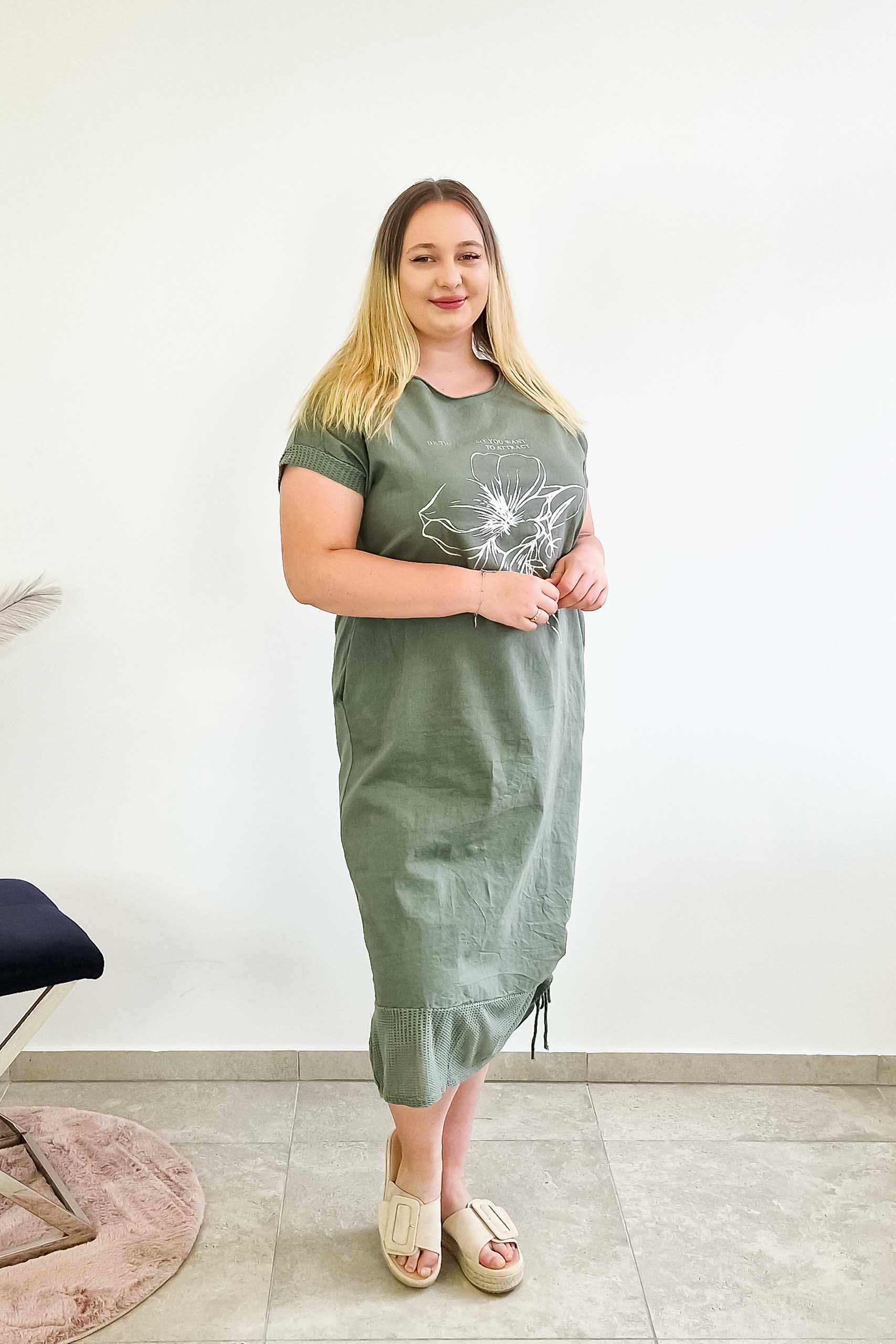 Dostępna w modnych, stonowanych kolorach – fango, niebieskim i oliwkowym – będzie świetną bazą do wielu letnich stylizacji. Noś ją z sandałkami, espadrylami lub sneakersami, dodając torebkę typu shopper albo plecioną listonoszkę. To elegancka sukienka na co dzień, która sprawdzi się zarówno w pracy, jak i podczas wakacyjnych wyjazdów czy niedzielnego obiadu z rodziną i przyjaciółmi.