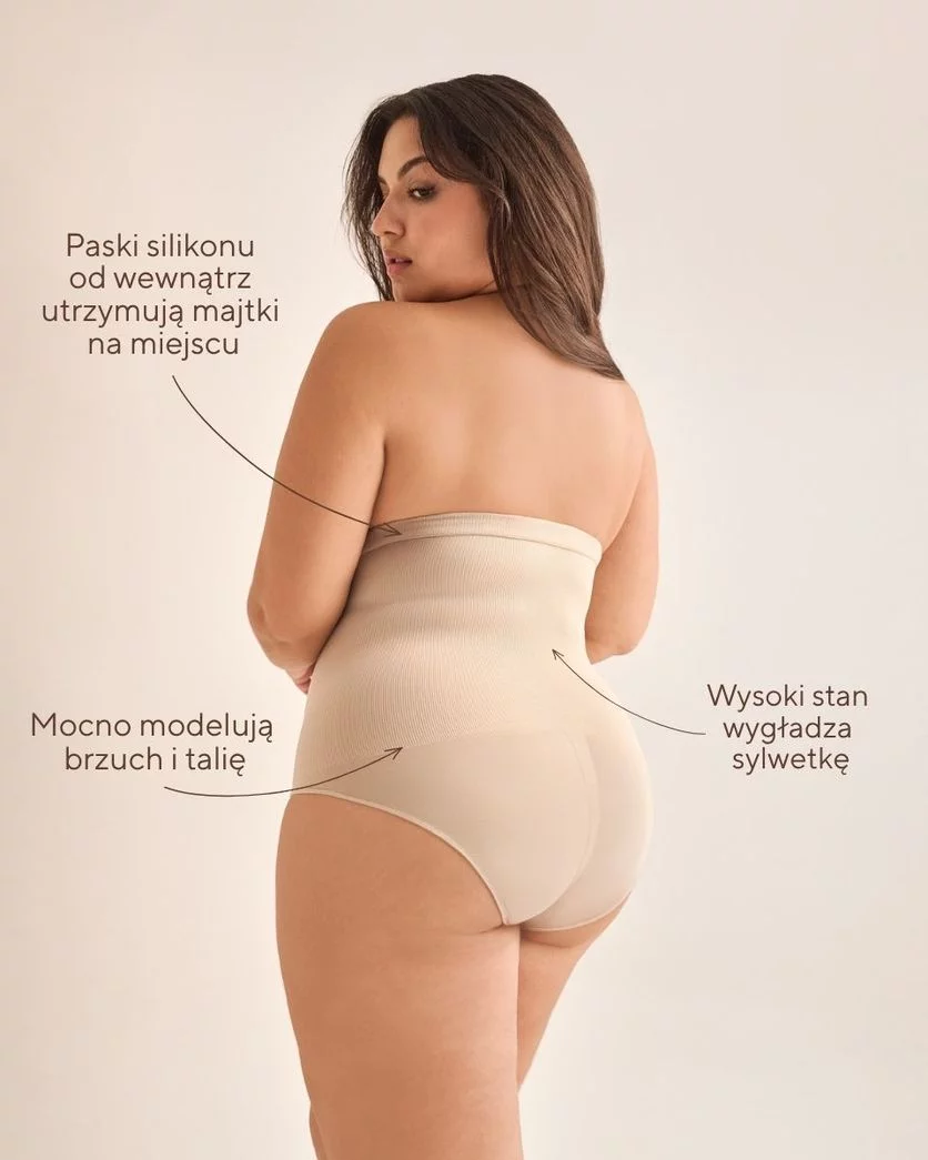 Ten fason został zaprojektowany tak, aby łączyć dwie rzeczy: mocne modelowanie i wygodę noszenia. Elastyczna, gładka dzianina dopasowuje się do sylwetki, nie krępuje ruchów i nie uciska, a szeroka, miękka gumka z silikonowym wykończeniem utrzymuje majtki na miejscu przez cały dzień. Dzięki temu nie zsuwają się ani nie rolują, pozostając niewidoczne pod ubraniem. Bardzo wysoki stan modeluje brzuch i talię, nadając sylwetce smuklejszy wygląd. Pełny tył daje poczucie komfortui sprawia, że to bielizna, którą naprawdę możesz nosić od rana do wieczora.