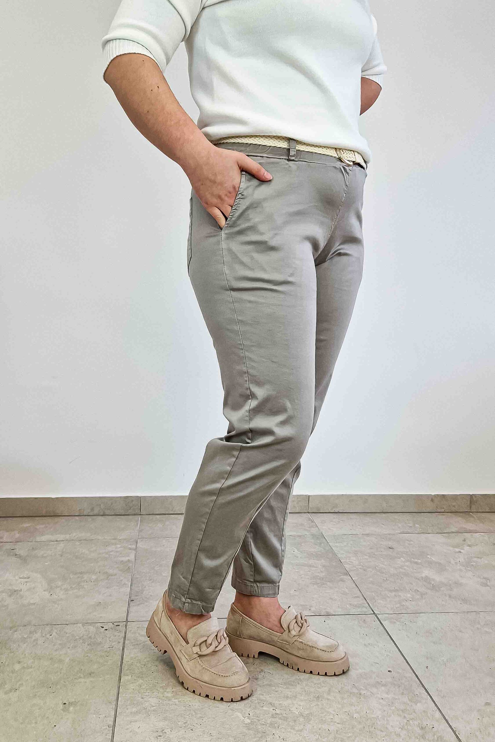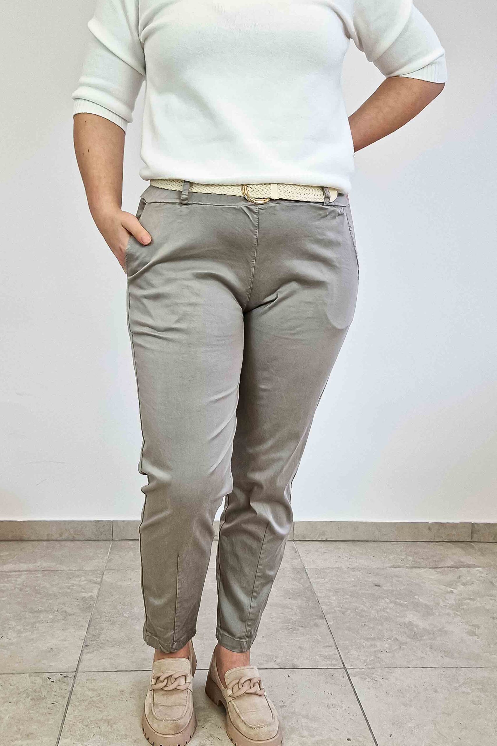 Dzięki elastycznemu pasowi na gumce spodnie idealnie leżą na figurze, nie powodując ucisku w talii. W zestawie znajduje się również pasek, który pozwala dodatkowo podkreślić kobiece kształty i nadać stylizacji bardziej dopracowanego charakteru. Zwężane nogawki z ozdobnymi przeszyciami optycznie wydłużają nogi i dodają smukłości sylwetce, co czyni ten model niezwykle korzystnym dla każdej figury.
