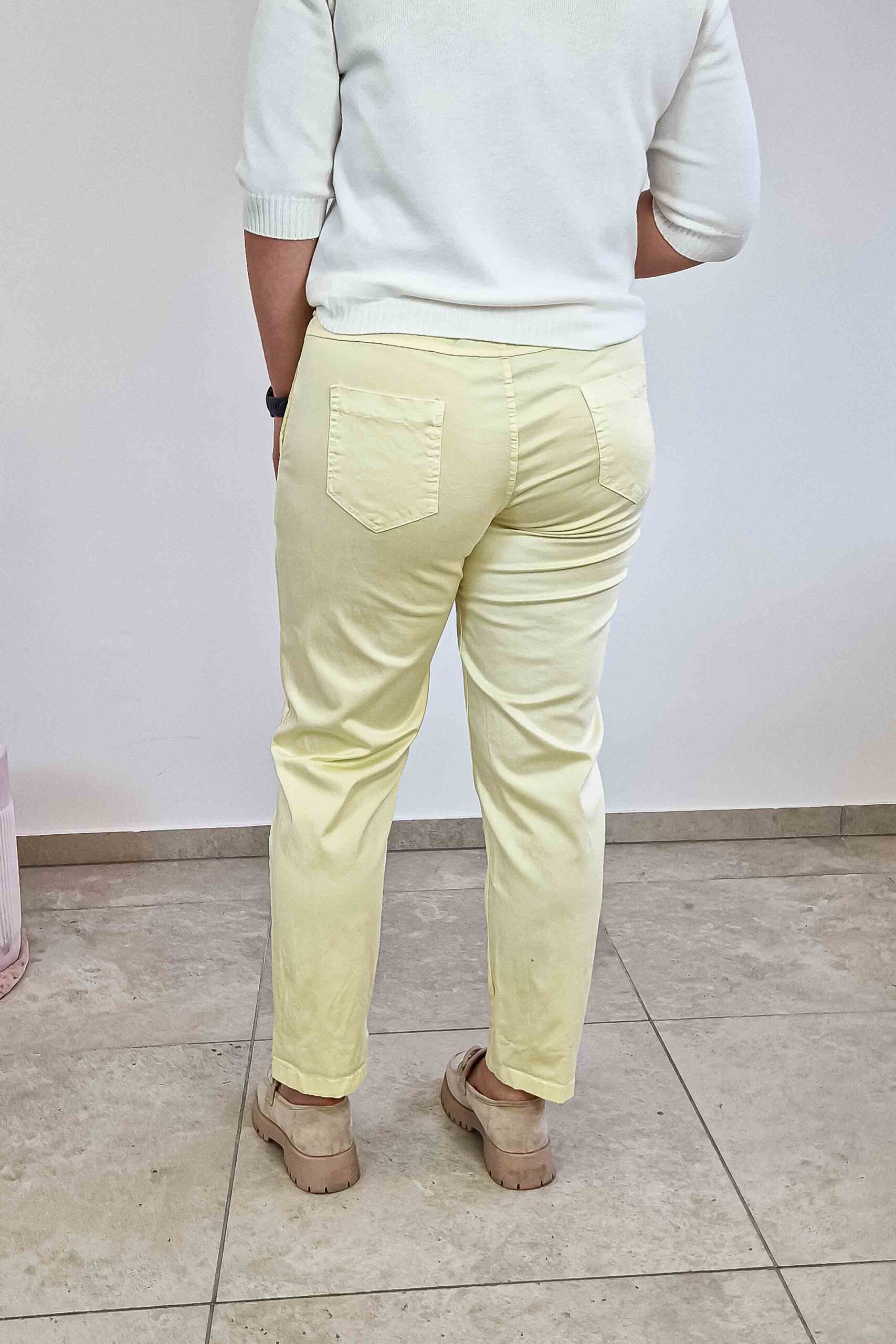 Dzięki elastycznemu pasowi na gumce spodnie idealnie leżą na figurze, nie powodując ucisku w talii. W zestawie znajduje się również pasek, który pozwala dodatkowo podkreślić kobiece kształty i nadać stylizacji bardziej dopracowanego charakteru. Zwężane nogawki z ozdobnymi przeszyciami optycznie wydłużają nogi i dodają smukłości sylwetce, co czyni ten model niezwykle korzystnym dla każdej figury.