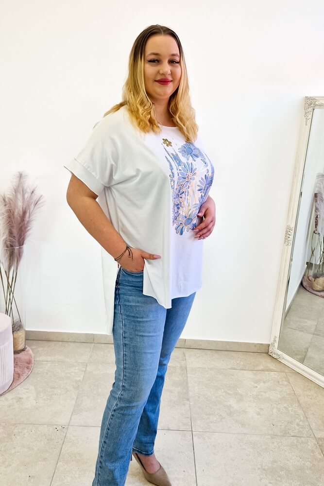 Niebieska bluzka damska z kwiatową aplikacją to esencja klasyki, która pozwala wyróżnić się na tle klasycznych, codziennych stylizacji. Uszyta z wysokogatunkowej bawełny z domieszką elastanu, bluzka jest nie tylko stylowa, ale również niezwykle komfortowa.