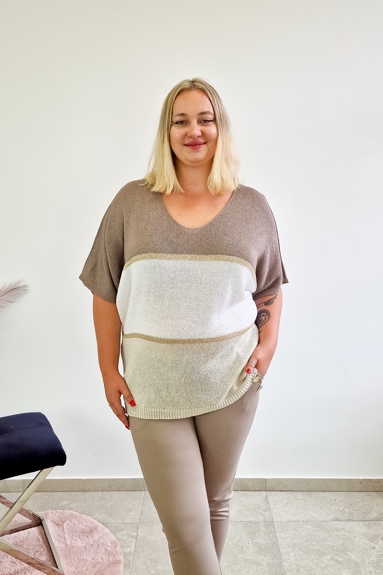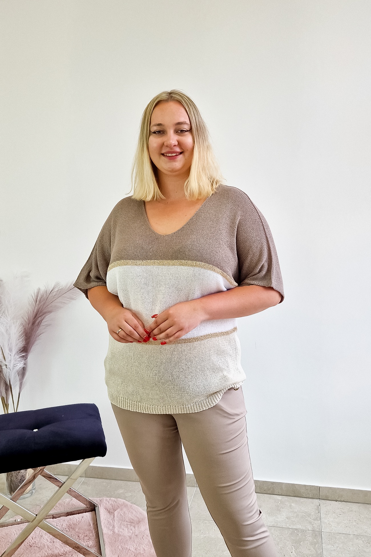 Ten elegancki sweterek damski na lato to must-have w szafie każdej kobiety, która ceni sobie klasykę w nowoczesnym wydaniu. Dzięki cienkiemu materiałowi, sweterek pięknie się układa i pozwala skórze oddychać, a jednocześnie dodaje stylizacji charakteru. Złota nitka nadaje mu wyjątkowego uroku – delikatnie połyskuje w słońcu i świetle, dzięki czemu nawet najprostszy zestaw zyskuje elegancki akcent.