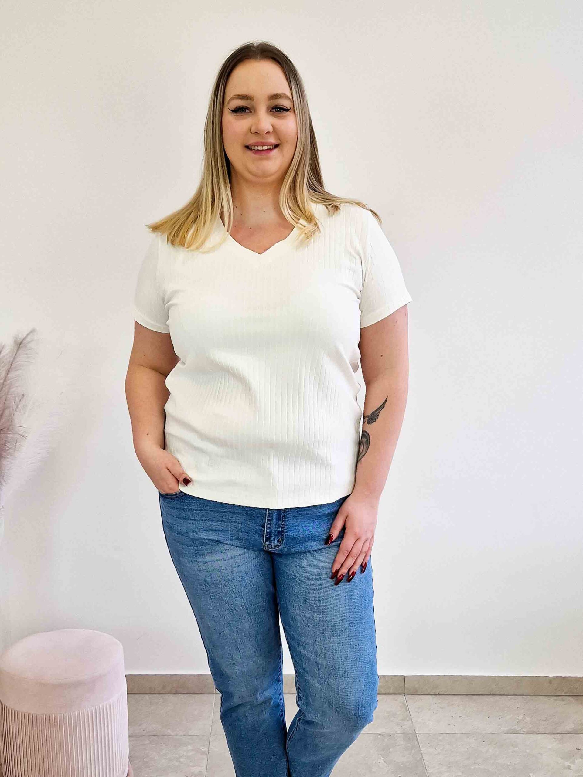 Model ten charakteryzuje się dużą elastycznością – obwód w biuście i biodrach dochodzący do 120 cm sprawia, że jest to doskonała bluzka plus size, która nie krępuje ruchów. Subtelny prążek dodaje całości nowoczesnego sznytu, sprawiając, że zwykły t-shirt staje się eleganckim elementem stroju. Wybierz swój ulubiony odcień: klasyczną czerń, modny wrzos, delikatny krem lub świeży błękit i poczuj jakość naturalnej bawełny.