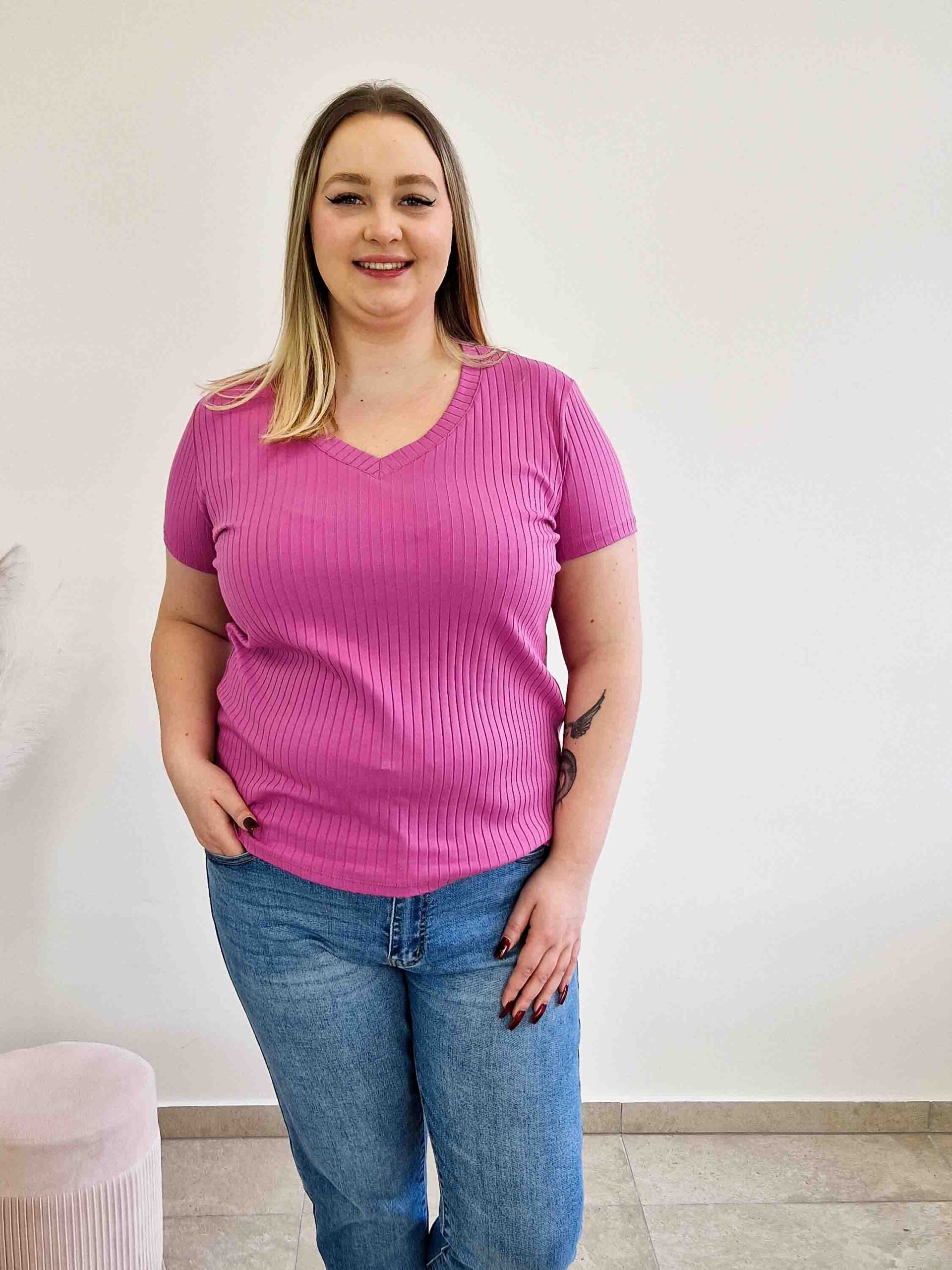 Prążkowana Bluzka Damska Basic z Dekoltem V Wrzosowa