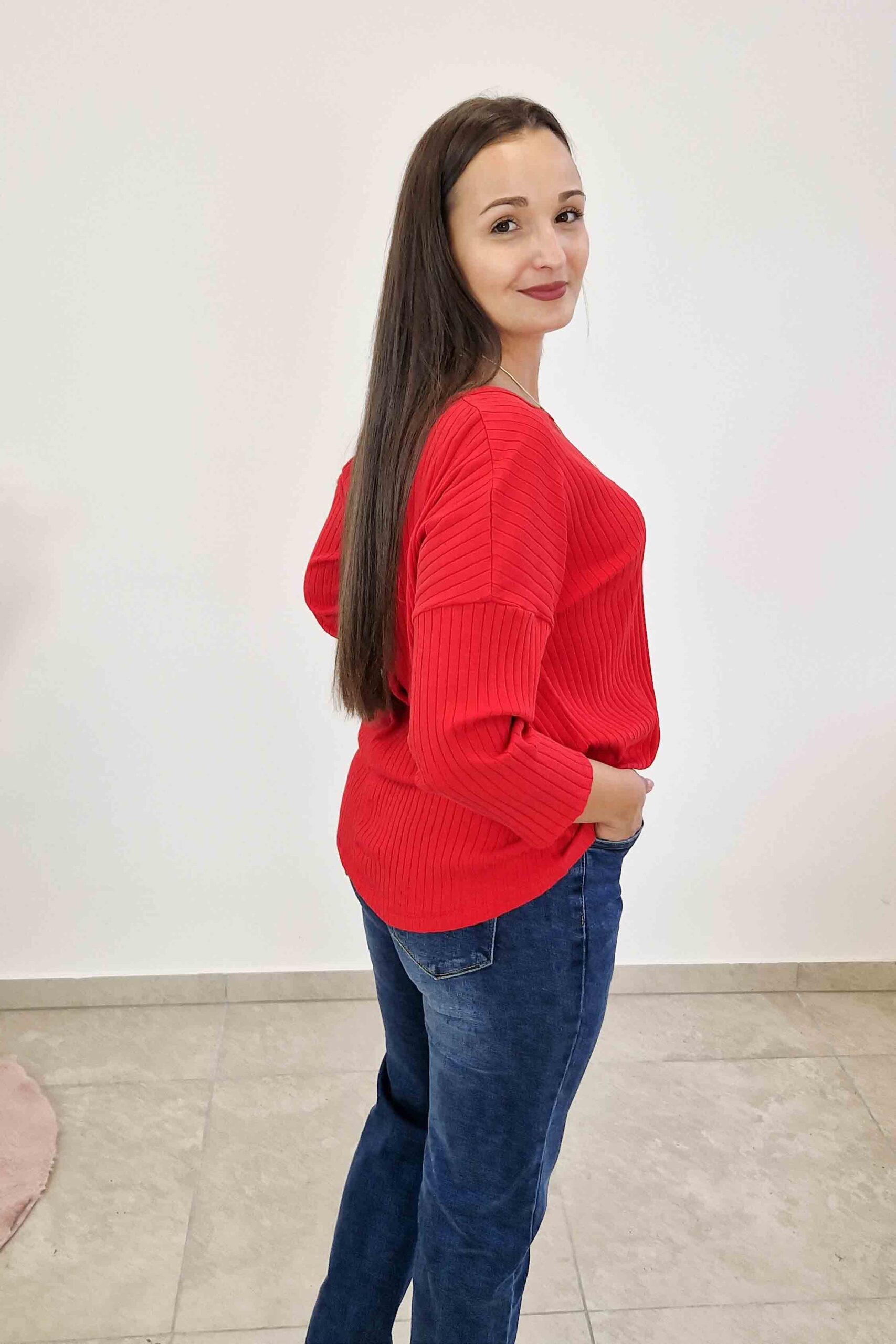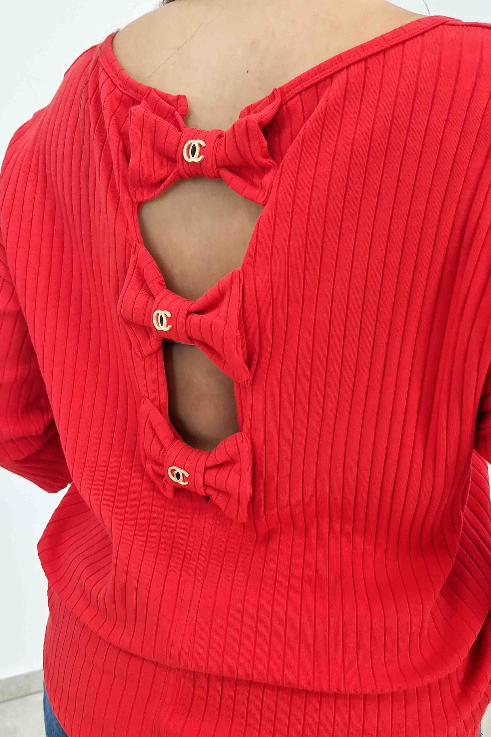 Prążkowana Bluzka Damska z Ozdobnymi Plecami Czerwona