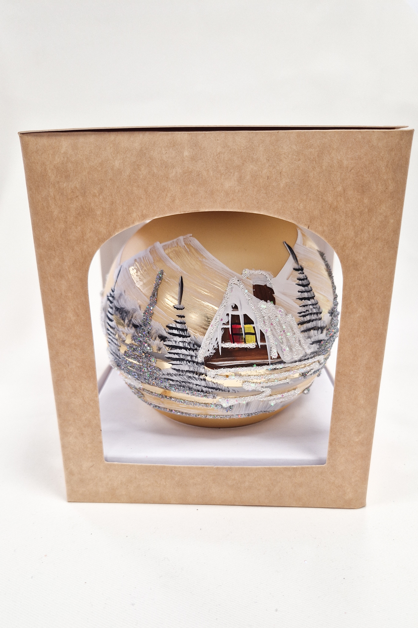 Dodaj swojemu wnętrzu odrobinę magii i elegancji dzięki, ręcznie malowanej bombce świątecznej ze stojakiem. Ta wyjątkowa ozdoba o wysokości zachwyca starannie odwzorowanymi zimowymi pejzażami – sceneriami z zaśnieżonymi domkami, lasami i szczegółami, które wprowadzają niepowtarzalny świąteczny klimat. Każda bombka to małe dzieło sztuki, ręcznie wykonane z dbałością o każdy detal, dzięki czemu każda jest unikalna i jedyna w swoim rodzaju.