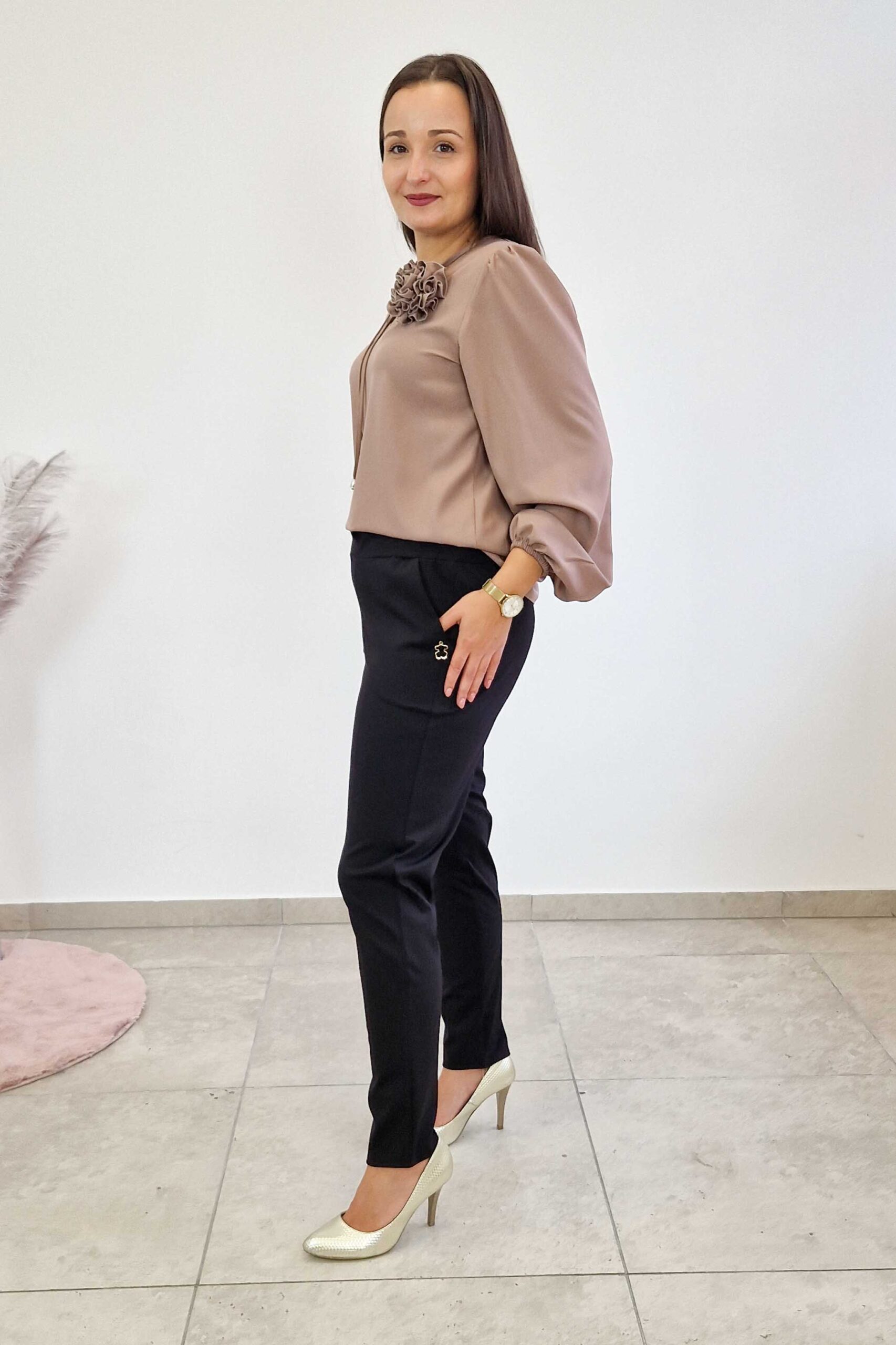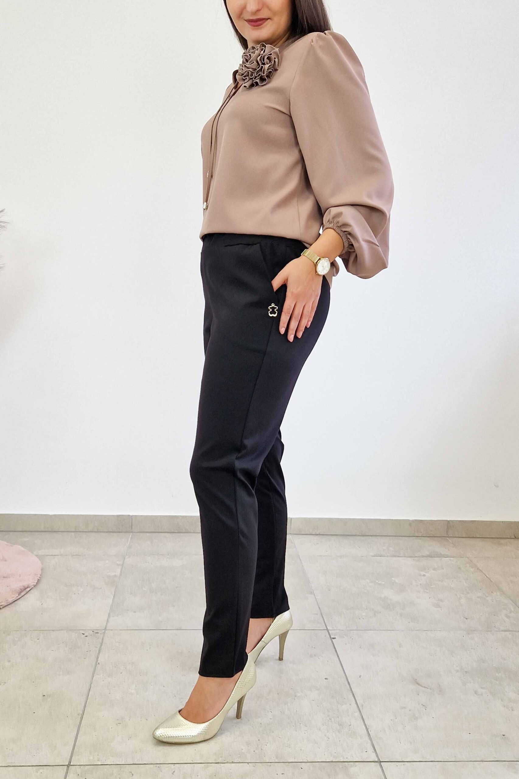 Spodnie zostały ozdobione delikatnymi złotymi guzikami przy kieszeniach – to idealna propozycja dla kobiet, które cenią sobie subtelne akcenty. Kieszenie z przodu i z tyłu dodają praktyczności, pozwalając na wygodne przechowywanie najpotrzebniejszych drobiazgów.