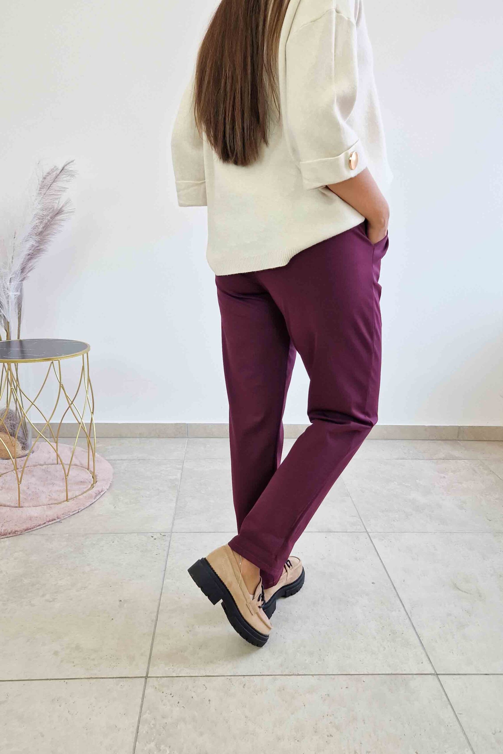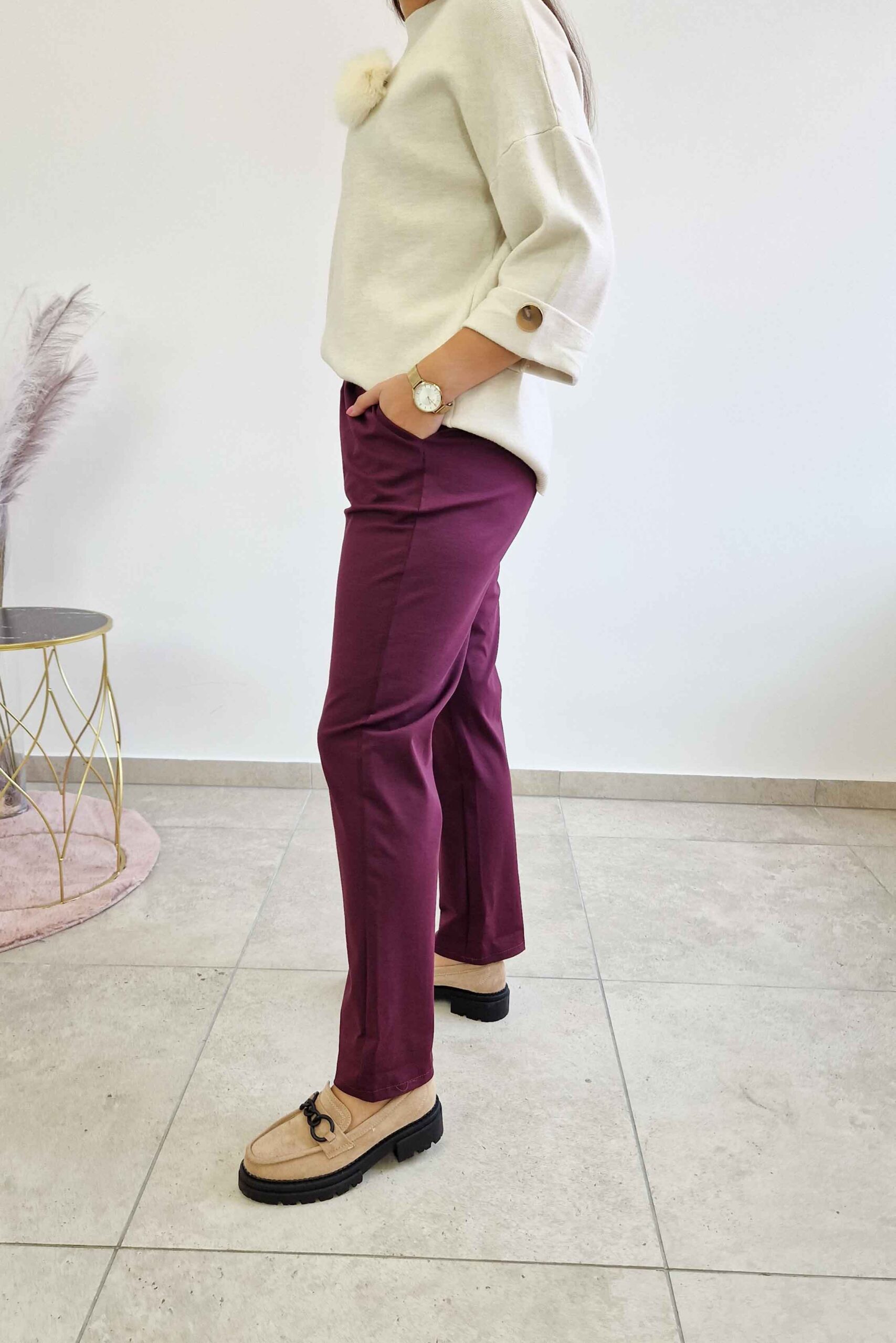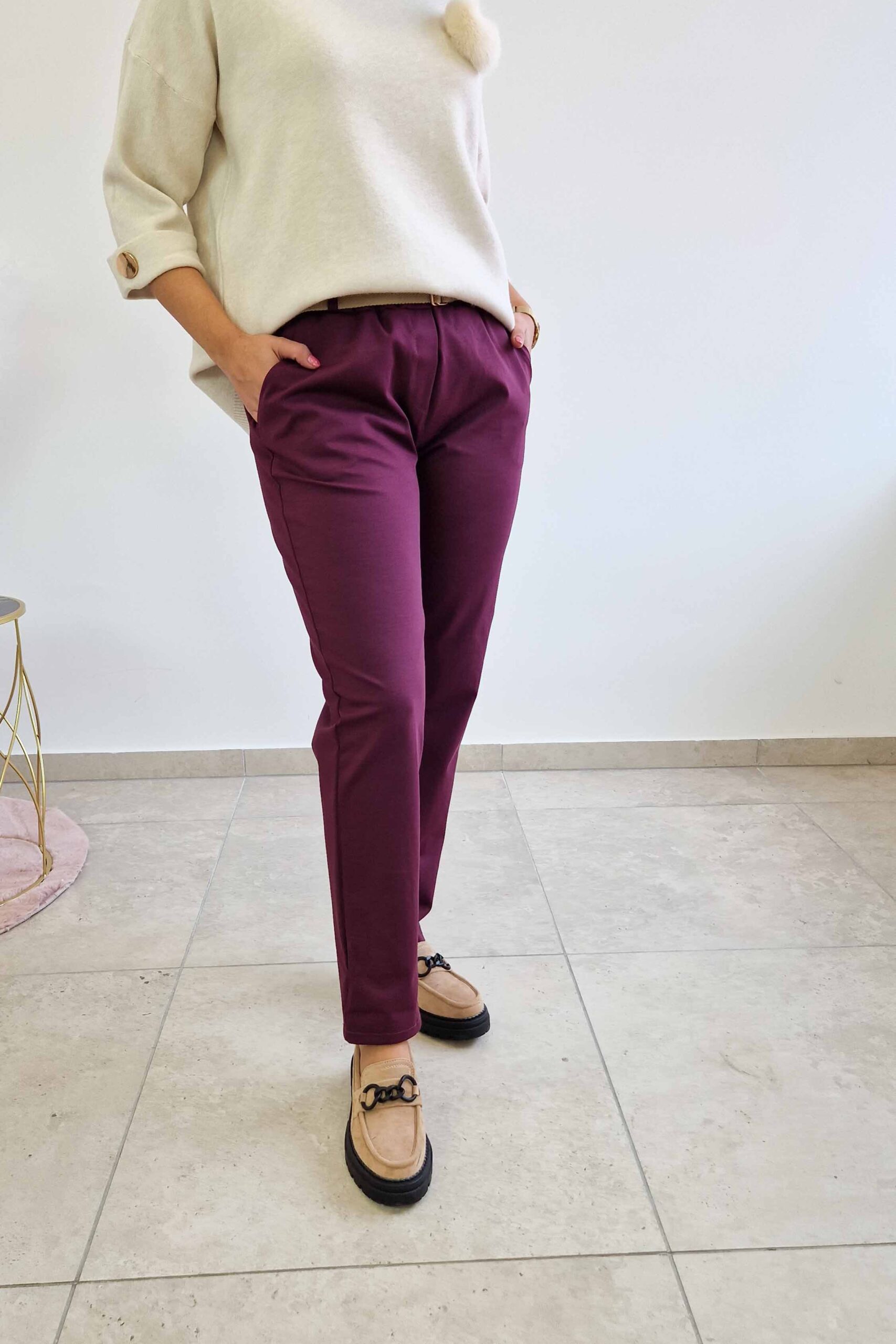 Spodnie mają klasyczny krój, który subtelnie podkreśla figurę, optycznie wydłużając nogi. Wyposażone są w praktyczne kieszenie, które dodają im funkcjonalności, a dołączony pasek podkreśla talię, modelując sylwetkę i nadając całości stylowego charakteru. Śliwkowy kolor to ponadczasowa propozycja, która pasuje do różnych typów urody i pozwala na wszechstronne stylizowanie spodni w zależności od okazji.