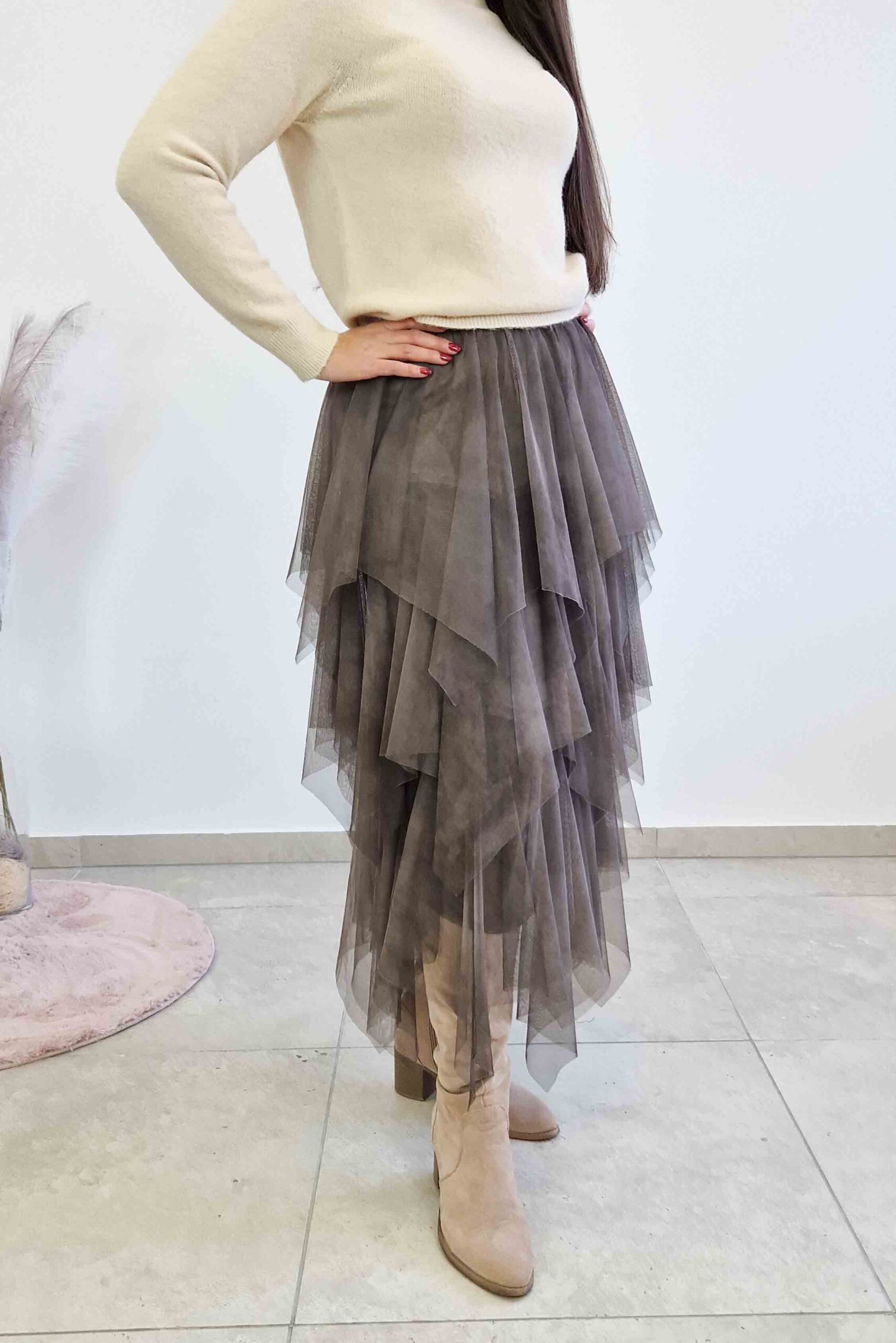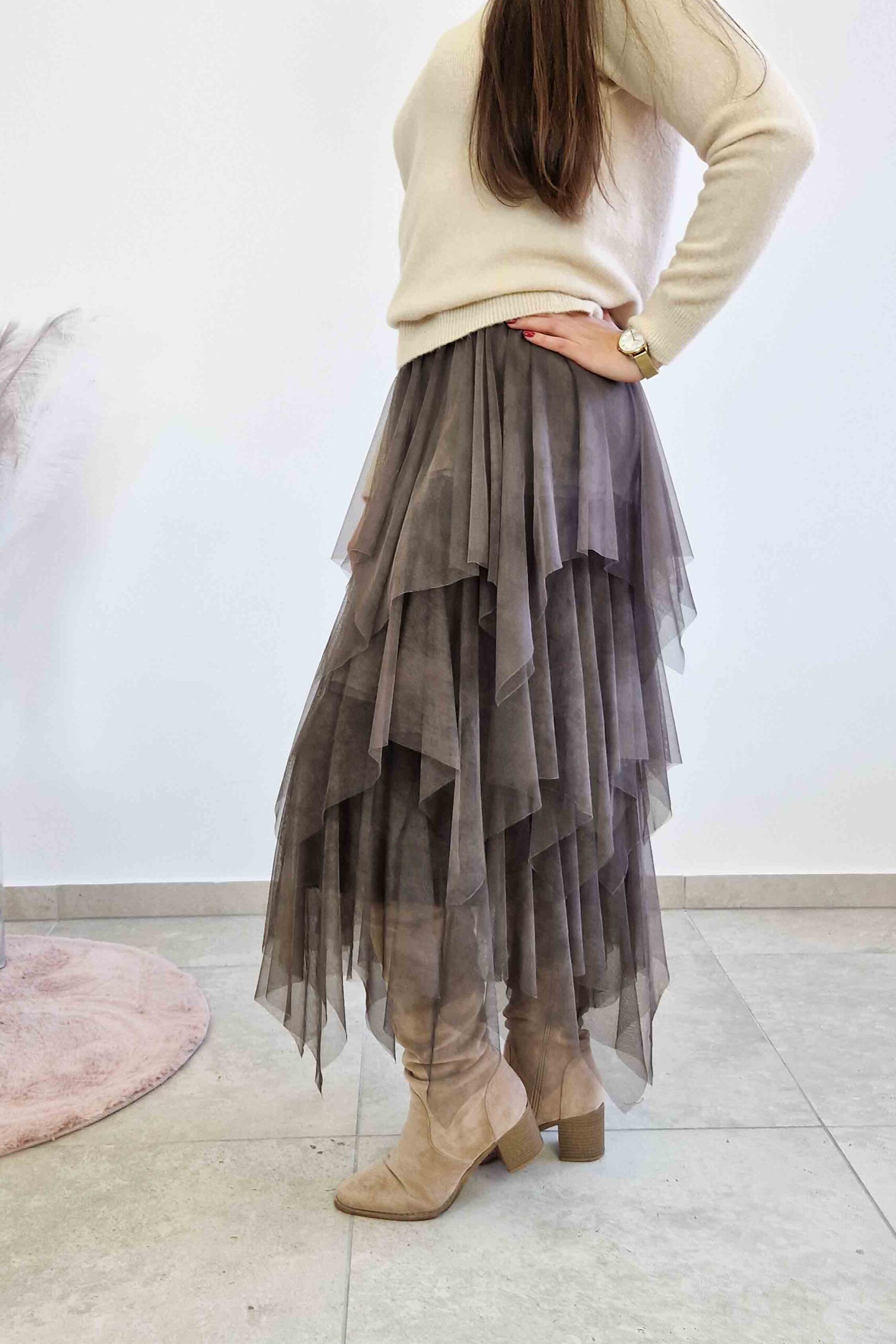 Ta spódnica maxi z falbanami to must-have w garderobie każdej kobiety, która lubi połączenie wygody i kobiecego wdzięku. Zwiewna siateczkowa tkanina pięknie układa się przy każdym ruchu, tworząc lekki, falujący efekt. Dzięki elastycznej gumce w pasie, spódnica dopasowuje się do sylwetki i jest niezwykle wygodna – nawet podczas całego dnia noszenia.