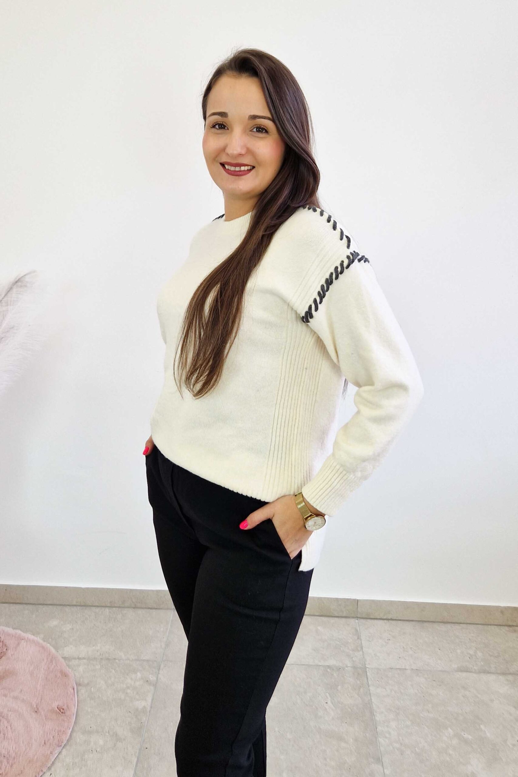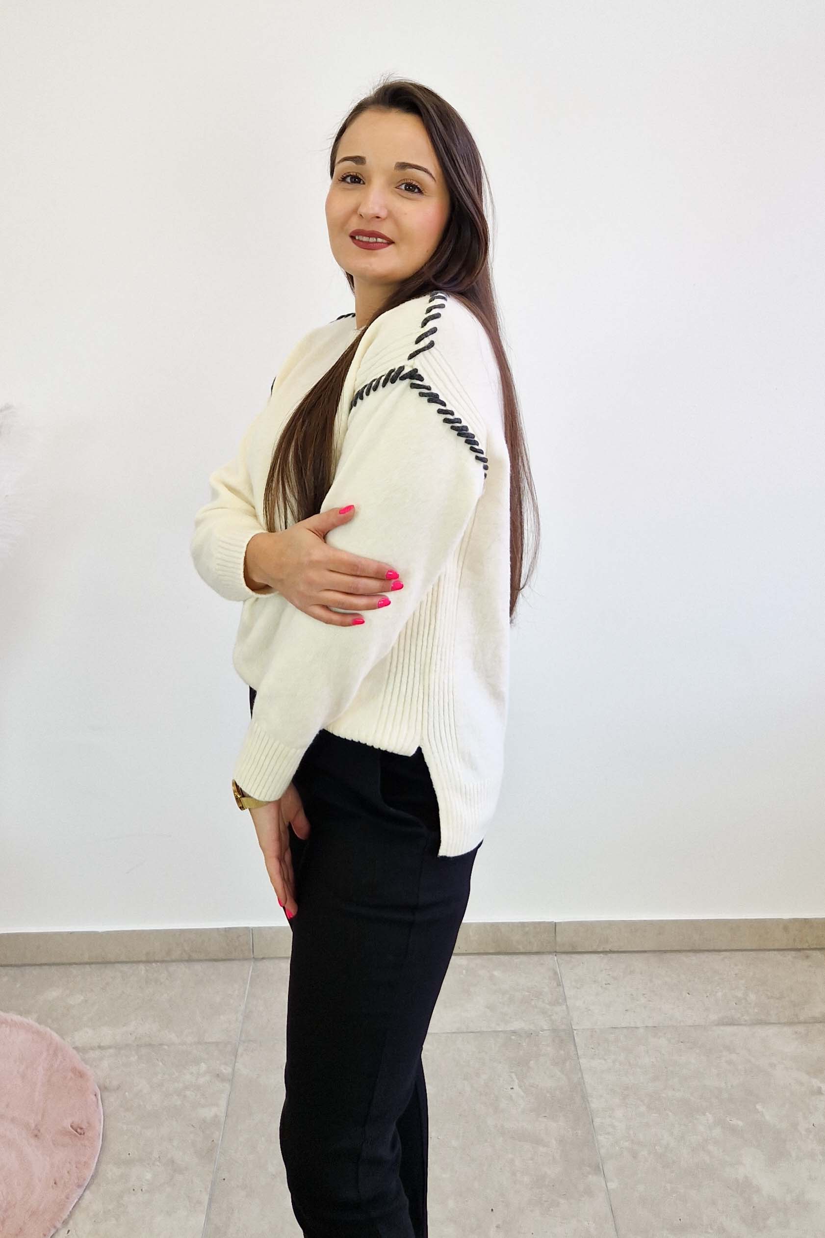 Ten modny sweter damski z długim rękawem to połączenie wygody i ponadczasowej elegancji. Subtelne przeszycia wzdłuż ramion i rękawów nadają mu wyjątkowego charakteru, jednocześnie pozostając w duchu minimalizmu. Miękka wiskoza w składzie sprawia, że sweter jest przyjemny w dotyku, nie gryzie i świetnie układa się na sylwetce.