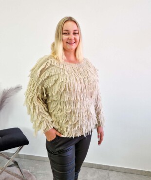 Dzięki miękkiej dzianinie, ciepły sweter z frędzlami pięknie układa się na sylwetce, a przy tym nie krępuje ruchów. To jeden z tych modeli, które zawsze wyglądają dobrze – wystarczy dodać ulubione spodnie, botki lub sneakersy, by stworzyć stylizację pełną kobiecego luzu i wygody.