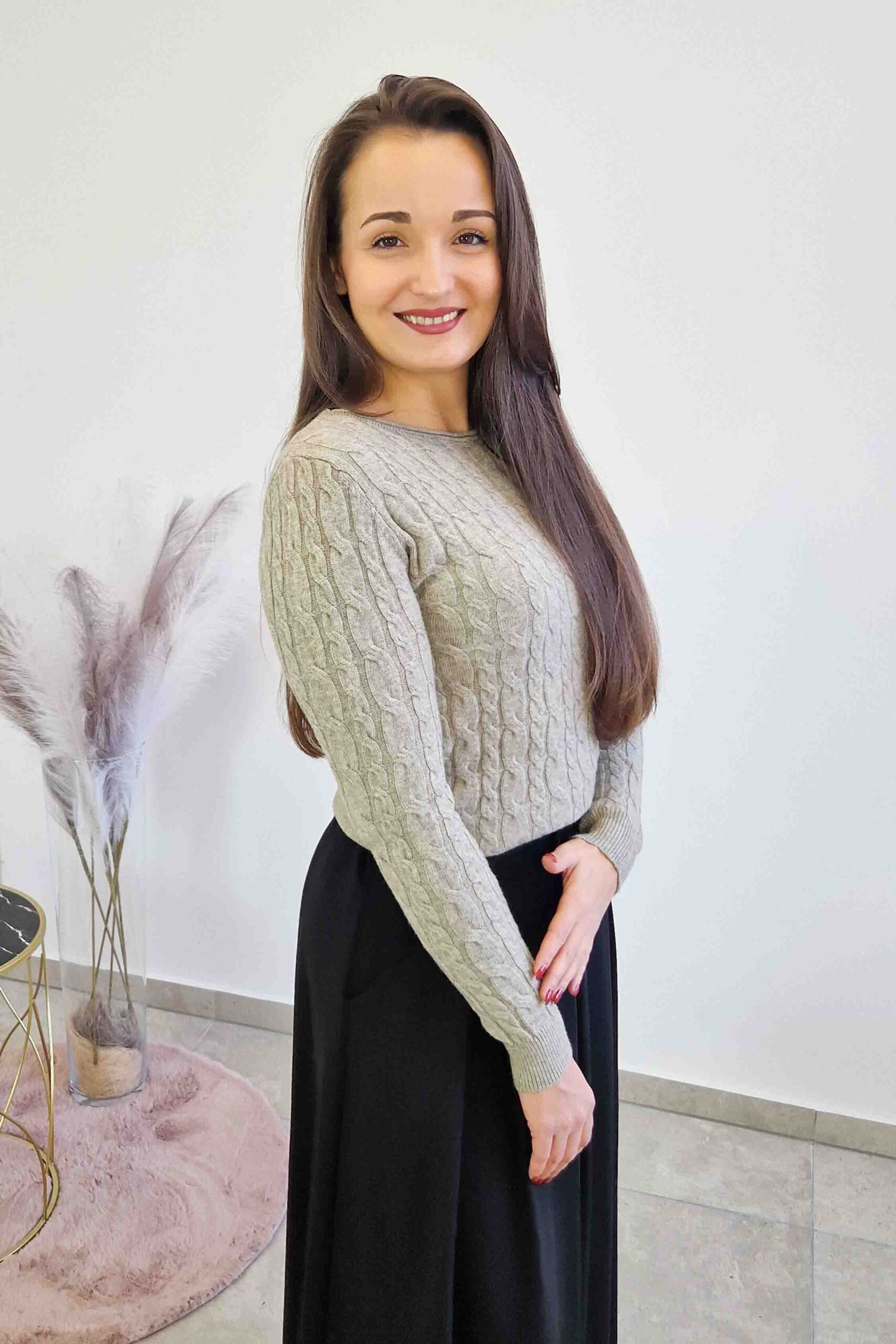 Dostępny w modnych odcieniach – beżowym, bordowym, oliwkowym, czarnym, popielatym i kremowym – pozwala dopasować kolor do każdej stylizacji. Wybierz beżowy sweter damski do codziennych looków, bordowy sweter na chłodniejsze wieczory lub czarny sweter ze splotem warkocz jako bazę do eleganckiego outfitu.